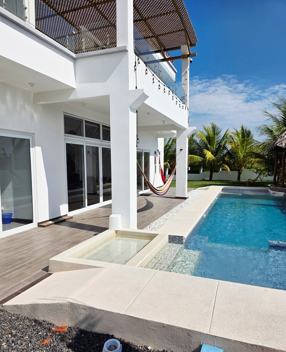 Beautiful new house to enjoy the beach as a family, private pool, social area, high-speed Wi-Fi and 4 identical rooms with 3 double beds, private bathroom, air conditioning and blackout curtains, located 300 meters from the beach and the condominium has a security booth.