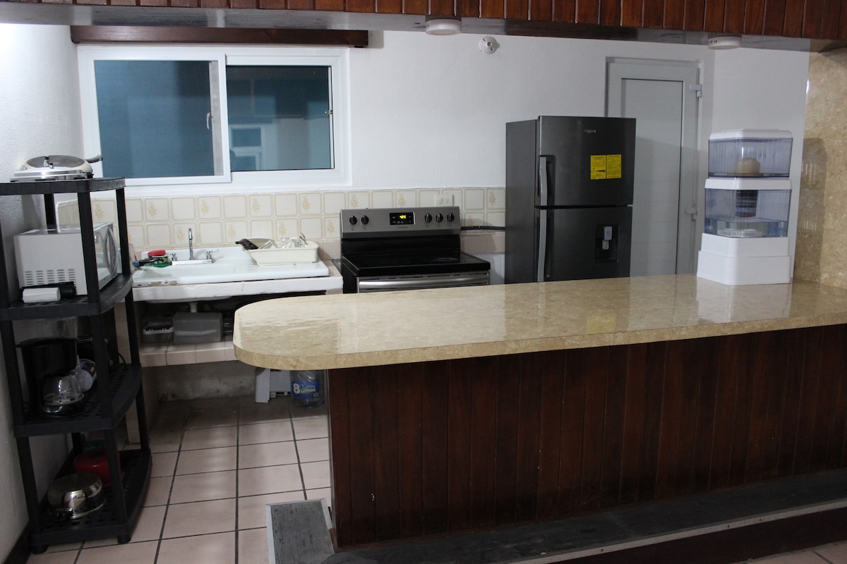 Welcome to your cozy and independent home in the vibrant heart of Puerto San Jose. This bright space features a fully equipped kitchen (stove, oven, microwave, fridge) and a sparkling clean, private en-suite bathroom, outdoor amenities pool, jacuzzi, foosball table, grill for those delicious BBQs.