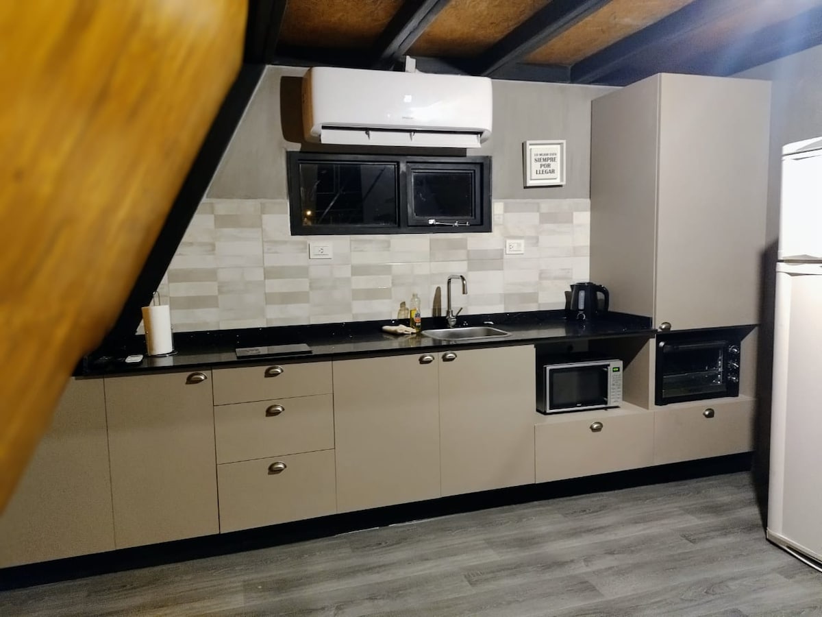 We invite you to enjoy our Patagonian loft, located on the ground floor, with no stairs to access but with a wooden deck over a beautiful patio. It has 1 bedroom with 1 double bed and 1 single bed, kitchen, living room, bathroom and laundry room. We offer a stove to enjoy the winter, a large garden, refrigerator, gas heating, kitchen, washing machine, Smart TV with DirectTV and WiFi. You will also have semi-covered space to store 1 vehicle.