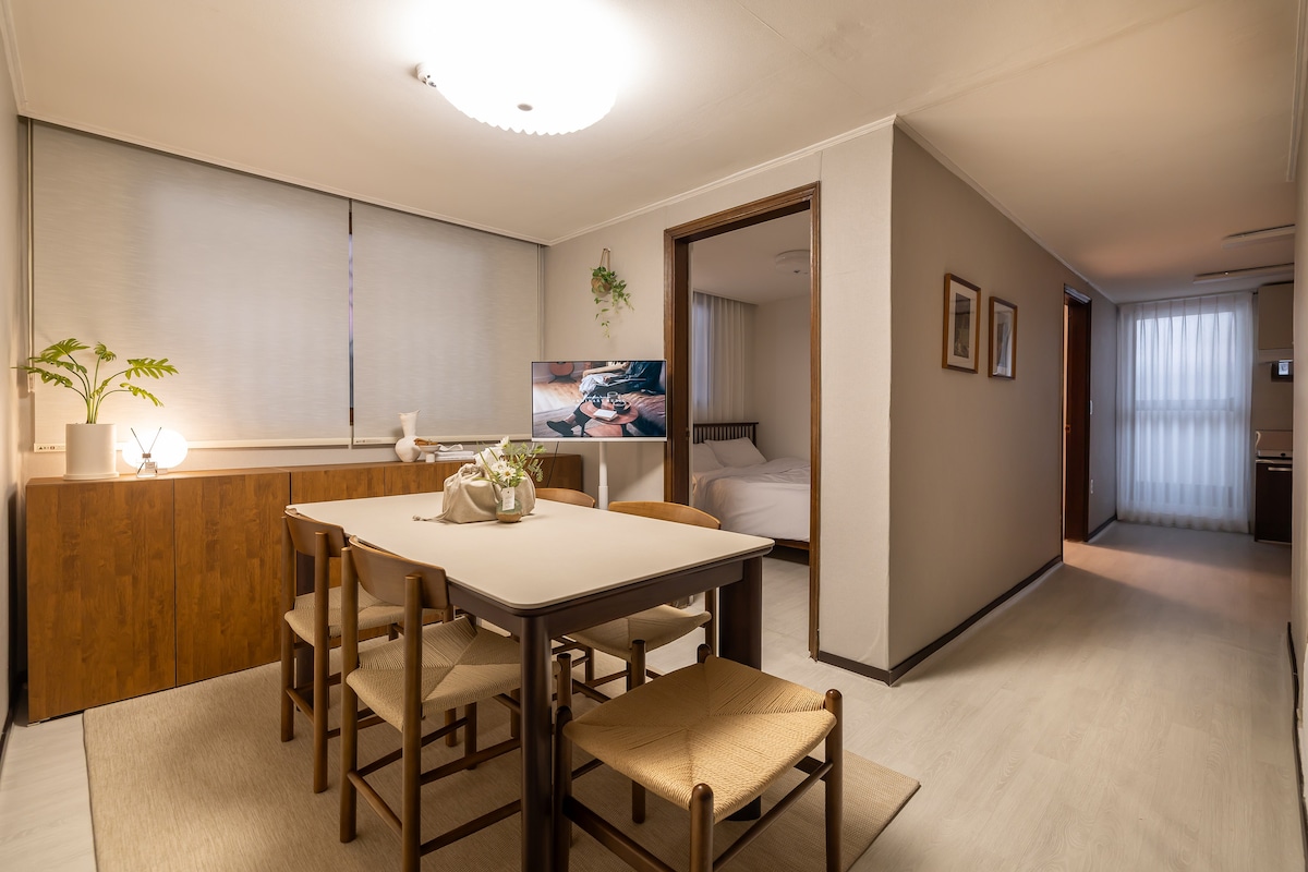 Hello. 😊 Welcome to Ari Stay, a comfortable and cozy emotional accommodation. A cafe-like study desk space with a wall-mounted circular mirror and a wood-toned shelf. Height and illumination suitable for laptop work, warm mood lighting Recommended as a place for self-photography and emotional photos with detailed production such as books, coffee cups, and dry flower props There is a separate desk space, so it is also recommended for remote workers or digital nomad travelers. Quiet residential atmosphere + warm lighting composition Conveniently available for charging electronic devices, a cup of coffee, and even laptop work Making memories with friends.❤️ Travel with your lover.❤ ️ We will provide comfort like your own home and comfort like a hotel so that you can enjoy a relaxing trip with your family.❤️ Take a walk, jog, or have a cup of coffee. Live like a local in a quiet residential area. And even visiting hot tourist attractions~ All possible places. The longer you stay, the more attractive it is. ❤ ️