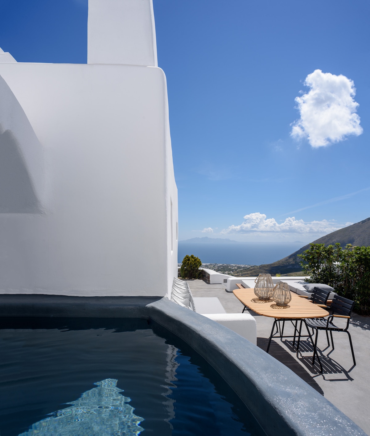 An outdoor area features a private plunge pool with a built-in Jacuzzi, surrounded by stone accents and lush greenery. A shaded patio with wooden details provides space for relaxation. The whitewashed walls blend seamlessly with the natural landscape, creating a serene and inviting environment.