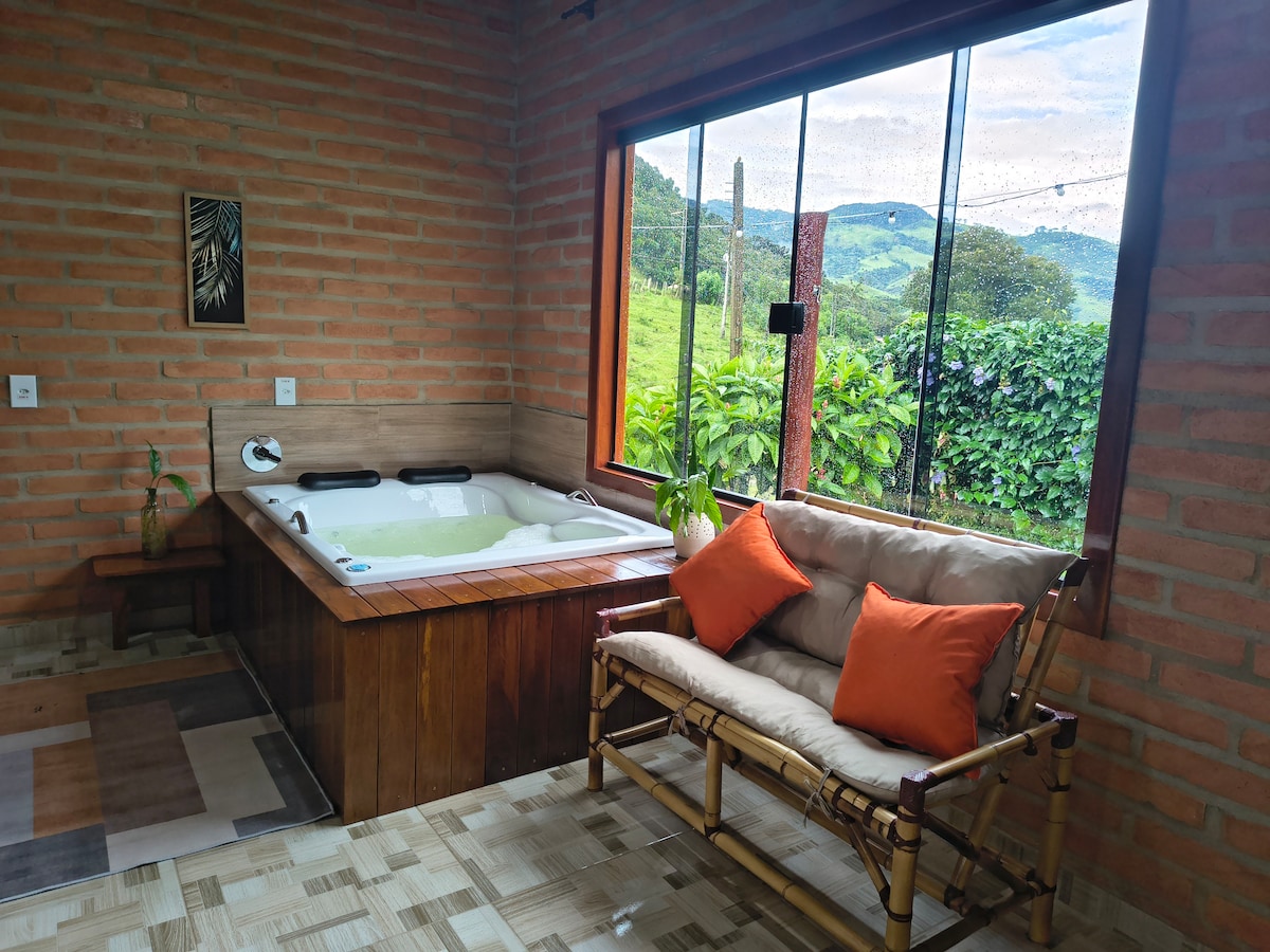 Encante-se com este refúgio aconchegante no alto de uma montanha com vista panorâmica para todo o vale. Nosso espaço é confortável e versátil, e comporta de 2 a 8 pessoas,sendo até 4 em cada chalé. A hospedagem oferece jacuzzi com espaçoso deck panorâmico, churrasqueira,uma linda lareira externa com fogo no chao e redario com vista para a mata,tudo de uso exclusivo e totalmente privativo. Ao entorno vc poderá apreciar o Rio Jaguari e a Mata Atlântica ao som dos pássaros nativos.