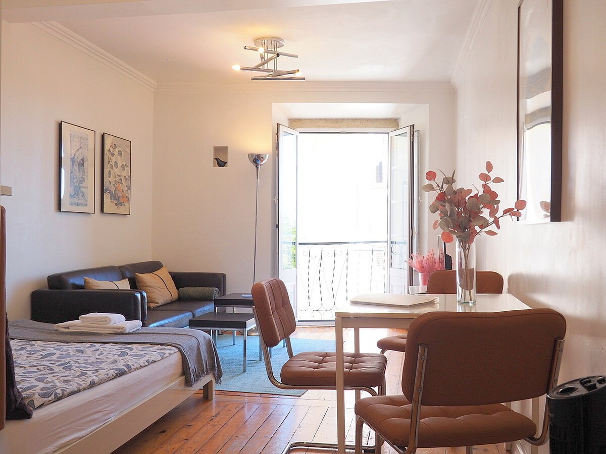 New apartment fully renovated, equipped with air conditioning and heating, it's located in the heart of Alfama district. This bright and beautiful apartment, 3rd floor, is great for Couples and Friends! Combines a cozy atmosphere, nice decor and modern amenities. Can fit up to 3 people (4 people with young kids u13), divided by 1 room with double bed, and a sofa-bed in the living room.