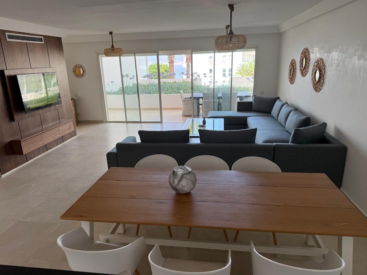 **Merci de lire la description jusqu’à la fin** Découvrez notre charmant appartement à Tanger, idéalement situé dans un complexe fermé et sécurisé, à deux pas du Movenpick, du Casino de Tanger, ainsi que des cafés et restaurants. Profitez d’une magnifique terrasse spacieuse avec vue imprenable sur la baie de Tanger, parfaite pour un café le matin ou un apéritif au coucher du soleil. Idéal pour couples et familles en quête d’une escapade inoubliable.