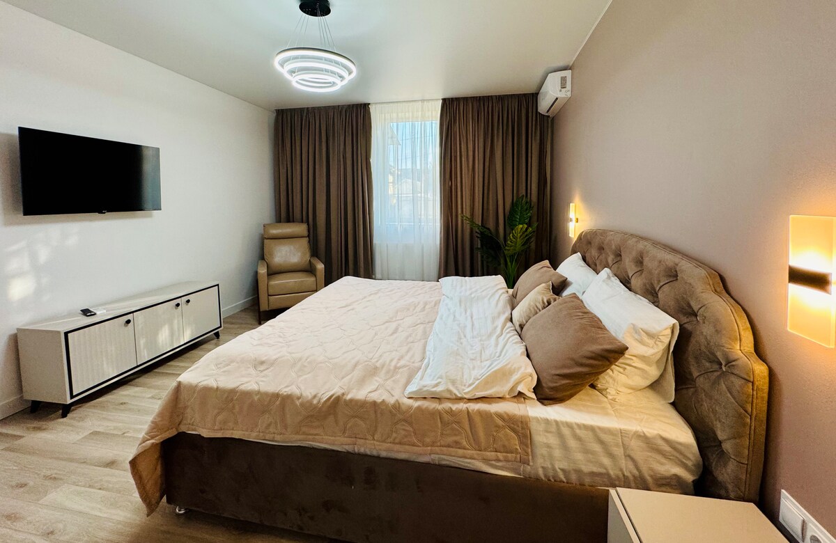 Добро пожаловать в стильную De Luxe квартиру, созданную для тех, кто ценит комфорт, эстетику и идеальное расположение. Апартаменты находятся в самом центре города — все ключевые места, рестораны, кафе и достопримечательности в шаговой доступности.