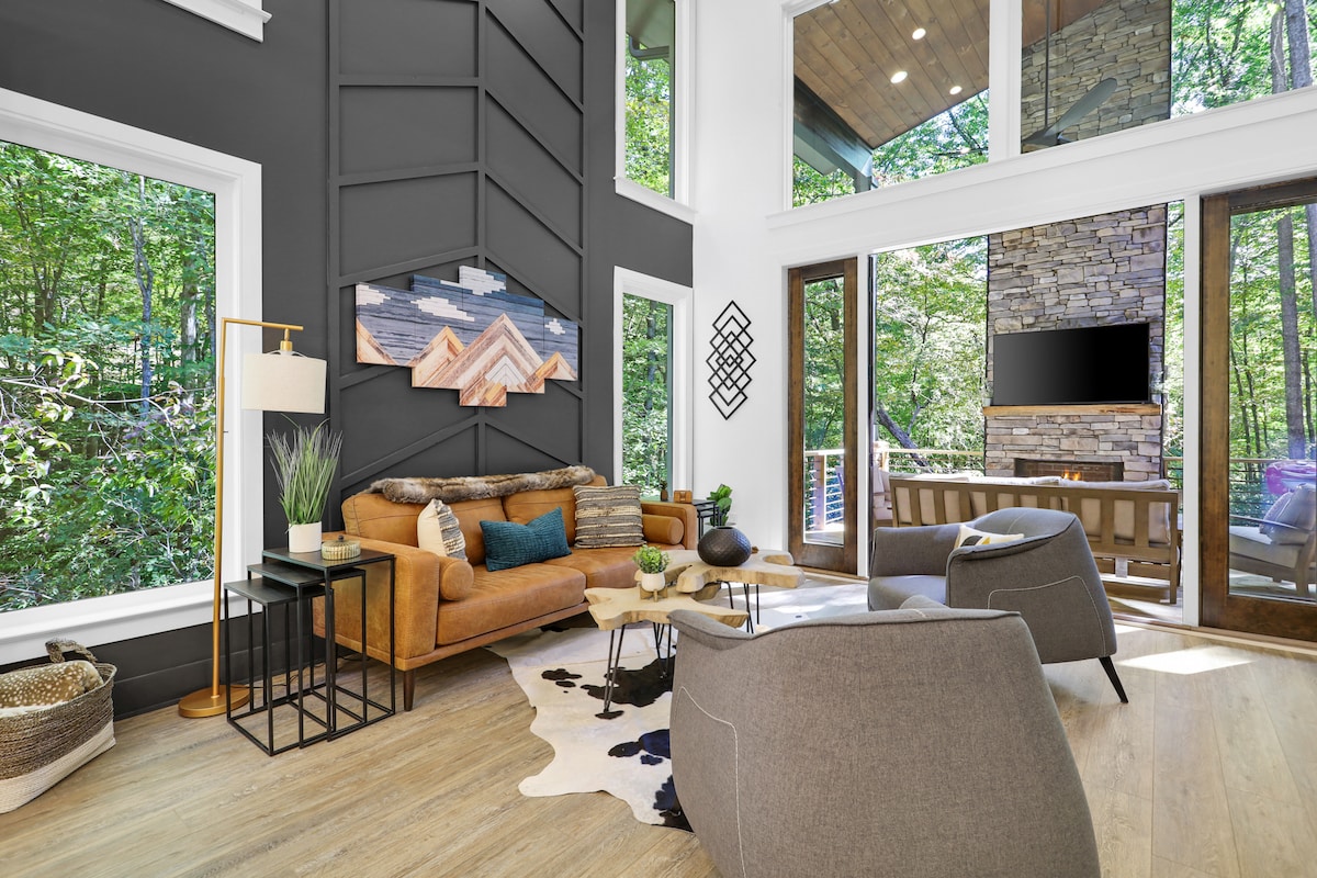 Enjoy lake and mountain views in this updated oasis amongst the trees. Whether you're looking for an outdoor adventure or a rejuvenating escape, we have it all! Situated on a five acre lake, enjoy the private dock and use of our two paddle boards and canoe. After a day of hiking, decompress in the hot tub and sauna. Tons of space to gather both indoors and outdoors, we hope you'll enjoy all the modern amenities while reconnecting with nature. Just 12 minutes to downtown Ellijay!