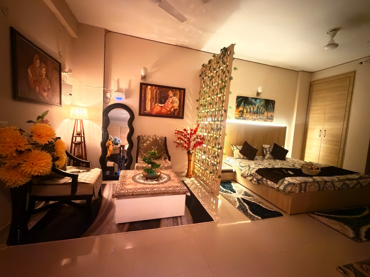 Welcome to Shrisaa Homes - A Boutique Stay, a thoughtfully designed studio apartment located in one of Vrindavan’s most popular and well-connected society. With its mix of Rajasthani charm and modern elegance, this boutique stay is perfect for couples, solo travelers, or small families looking for a unique and comfortable home in the holy city.