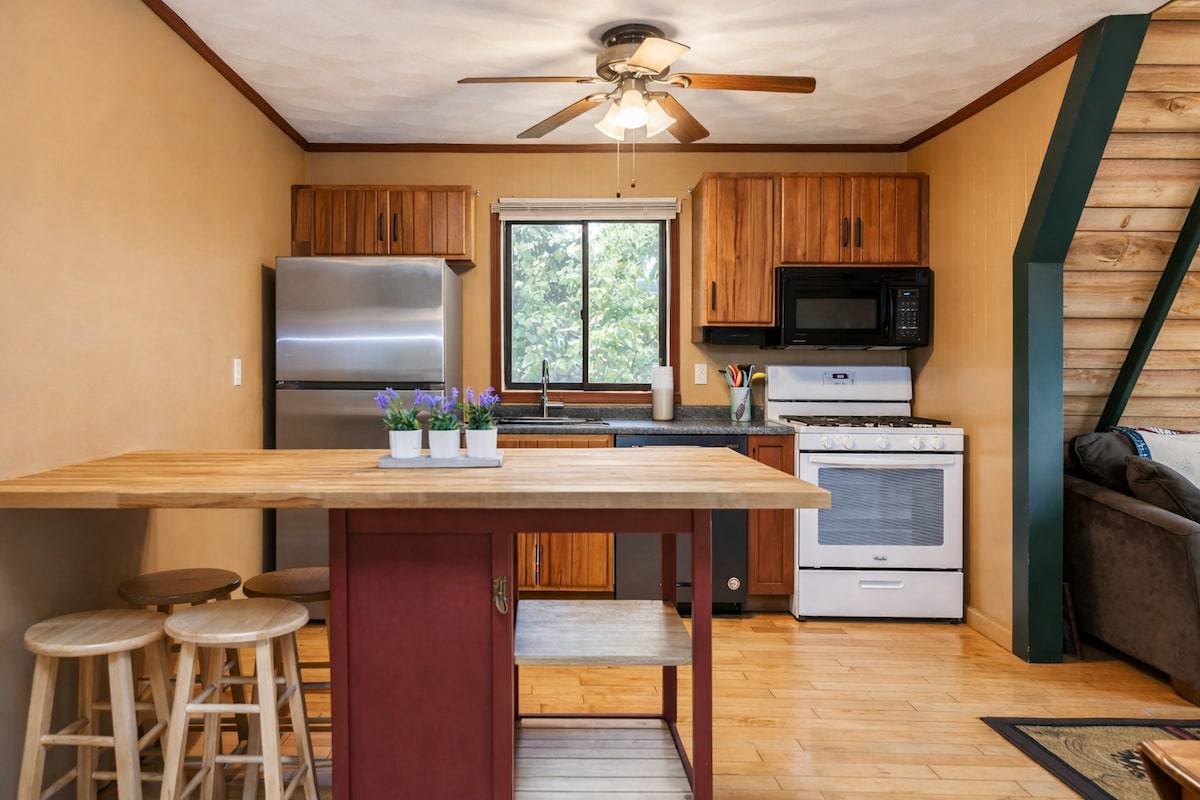 Escape to the country in this bright and cozy semi off-grid tiny cabin, nestled on a secluded, wooded hillside on our 110-acre farm. This nature getaway features a modern farmhouse interior with rustic accents. Take a moment to unwind on the front porch in comfortable Amish crafted Adirondack chairs. Put a record on and sip a glass of wine as you enjoy the sunset. Perfect for a couple or individual seeking to connect with nature, this rural pet-friendly retreat is the ideal tranquil getaway.