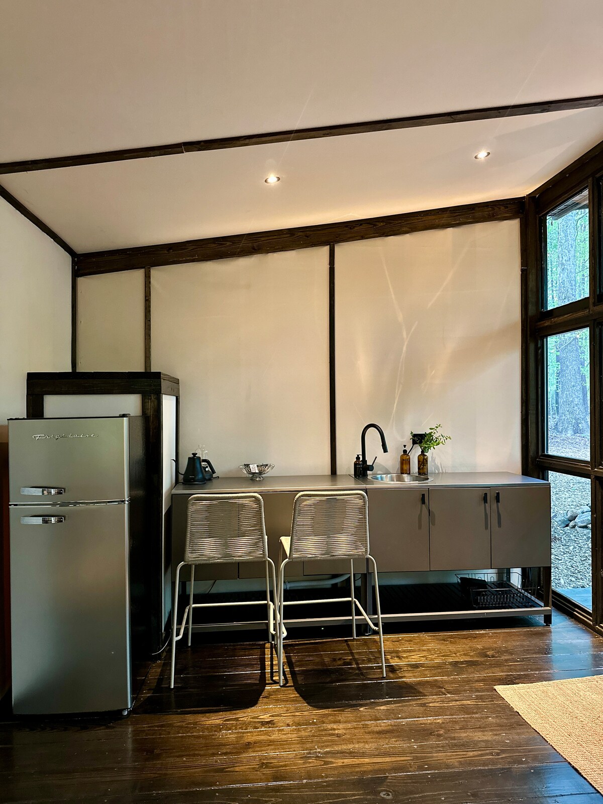 Mt Olive is the urban retreat you need. Getaway to this spacious, vintage-camp inspired, two bedroom cabin with a loft. Cozy up by the double-sided fireplace with a beverage of choice and your favorite people. Retreat for deep work as well. Our cabin features fast reliable wifi, a large working table, and a tucked away writing desk. Take in the wooded views from every room - you’ll forget you’re 10 minutes from the airport and 20 minutes from downtown.