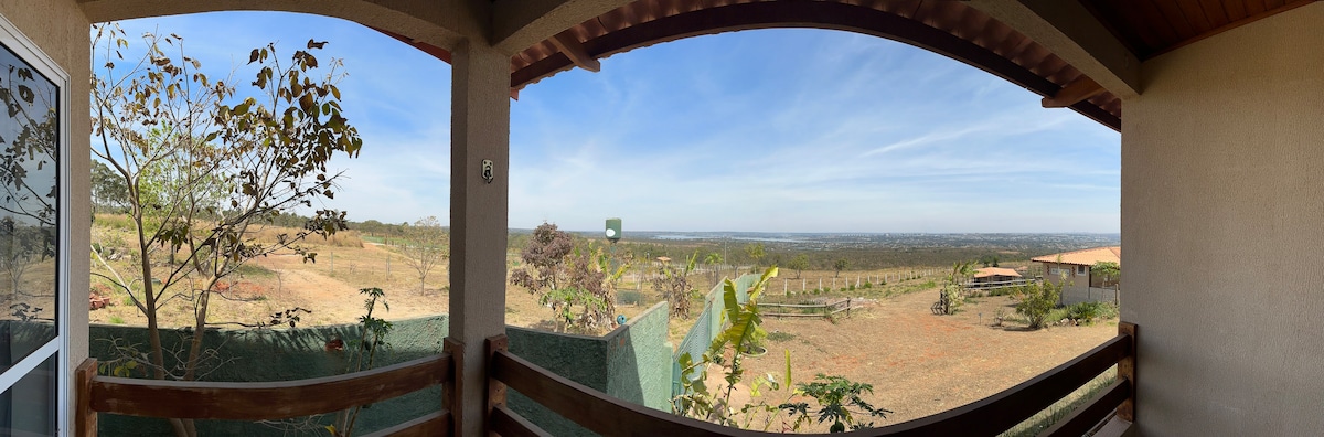 Chalé charmoso, acolhedor, situado em chácara de 20.000m2 de mata nativa preservada Localizada no Lago Oeste, a 30 min do centro de Brasília. Ideal para quem busca paz, tranquilidade, boas vibrações, mas não quer abrir mão do conforto e do Wi-Fi. Oferece experiências únicas: comer frutas no pé, contemplar o céu estrelado, ouvir o canto dos pássaros. Construção sustentável, ventilação agradável que dispensa ar-condicionado, possui vista deslumbrante, piscina natural sem uso de produtos químicos.