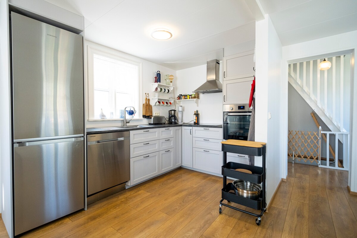 A small, beautiful and fully equipped house with all the comforts. Our extra home in the best location in Siglufjörður. Well renovated and attention to every detail. The house is on three floors, two rooms in the attic, on the middle floor there is a living room, kitchen and toilet with shower, in the basement there are two bedrooms, toilet with shower, laundry and ski/outdoor clothing storage. The house has the nickname Skógarahúsið. The house is suitable for 6-8 people if two sleep together in the double beds