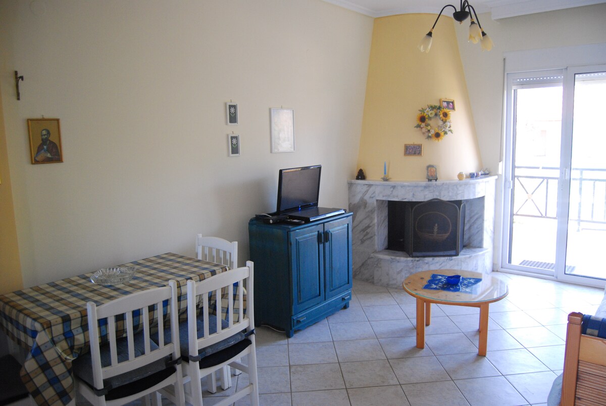 Explore the beautiful places of Chalkidiki and enjoy a wonderful and relaxing vacation in Modern Cozy Apartment by the sea!Sunny and bright with Cycladic art details, this totally renovated apartment is the perfect summer place just 90 meters from the sea in Flogita beach Fully equipped with one king size bed comfortable living room with a sofa-bed and big sunny balcony! Unbeatable location next to beach-bars restaurants, supermarket. Suitable for families and couples, 30’ from Macedonia Airport
