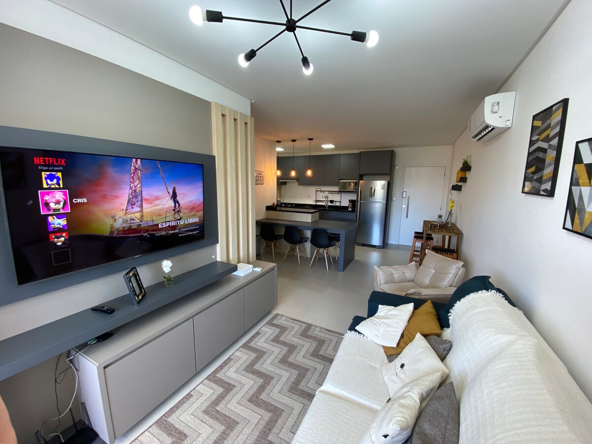 Welcome to our high-luxury two-bedroom apartment, one of which is a suite, with stunning views of the city and sea. Modern, with complete appliances, equipped kitchen, air-conditioning and washing machine. Sophisticated and cozy decor. Central location, close to Pátio Milano, with exclusive access to the swimming pool, fitness center, sauna. Whether for rest, leisure or business, our apartment in Florianópolis offers an unforgettable stay. Feel at home in your temporary home!