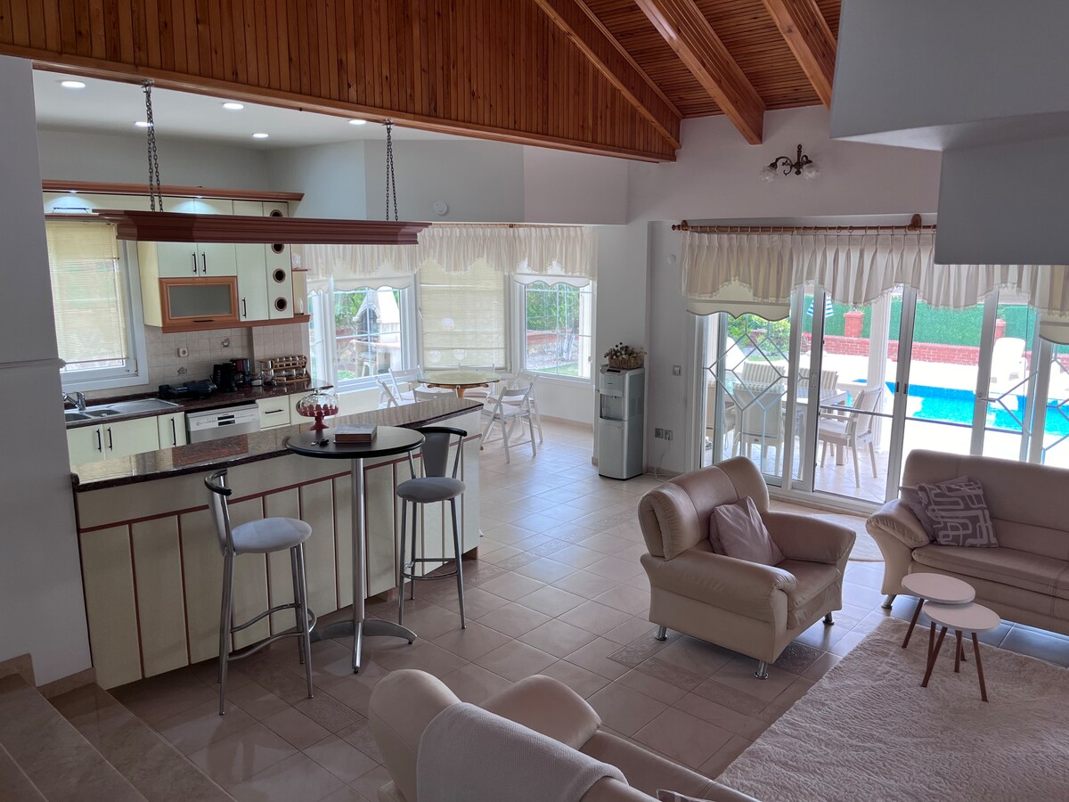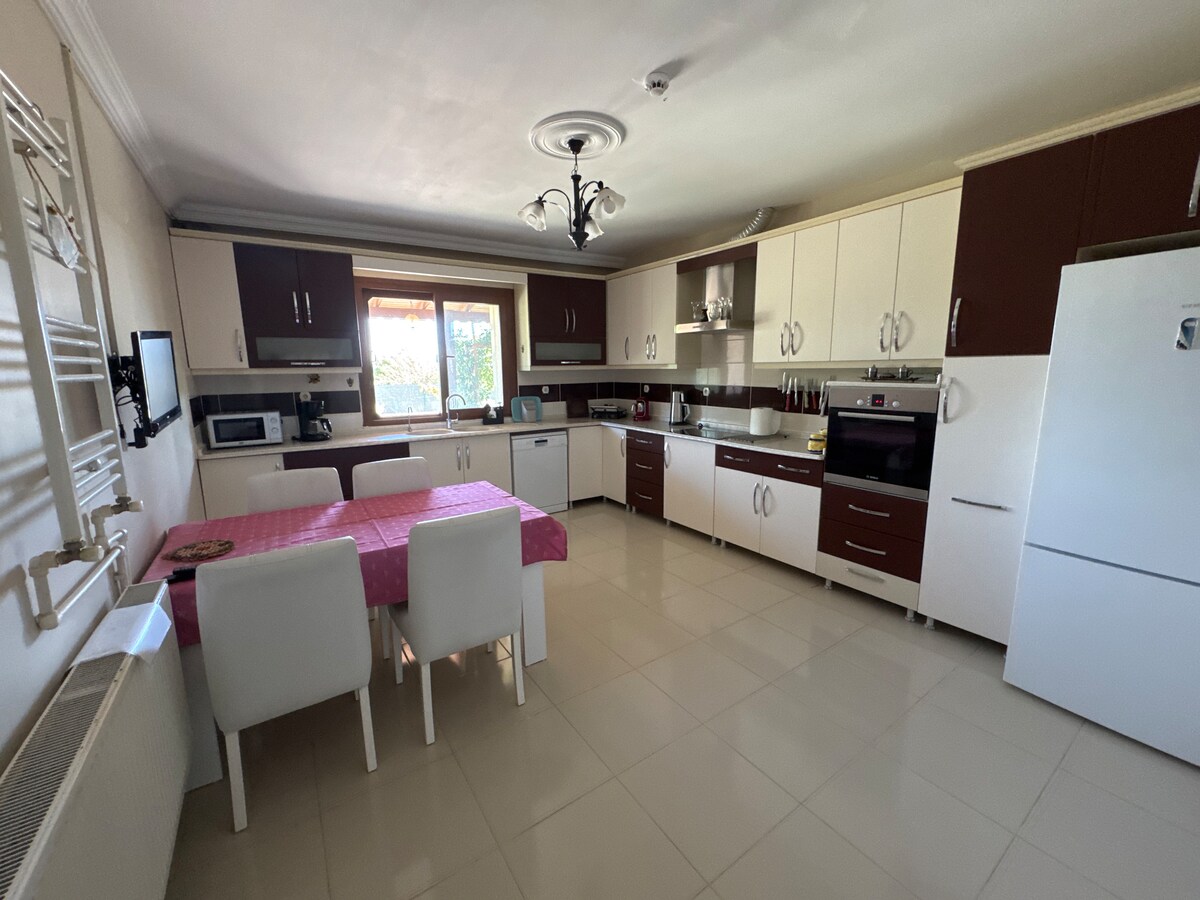 A place where you will enjoy the silence, calmness and peace with its original Greek and Italian architecture made of natural materials from natural stones, the ceilings of the room and the living room are between 4.30 - 5.30, all rooms are air-conditioned, the oxygen and energy of the house are indescribable with the spaciousness of the high ceiling. You can use the private pool on the back terrace of the house at any time, parking is available for your vehicle, hot water is available 24 hours a day without waiting with the shock water heater...