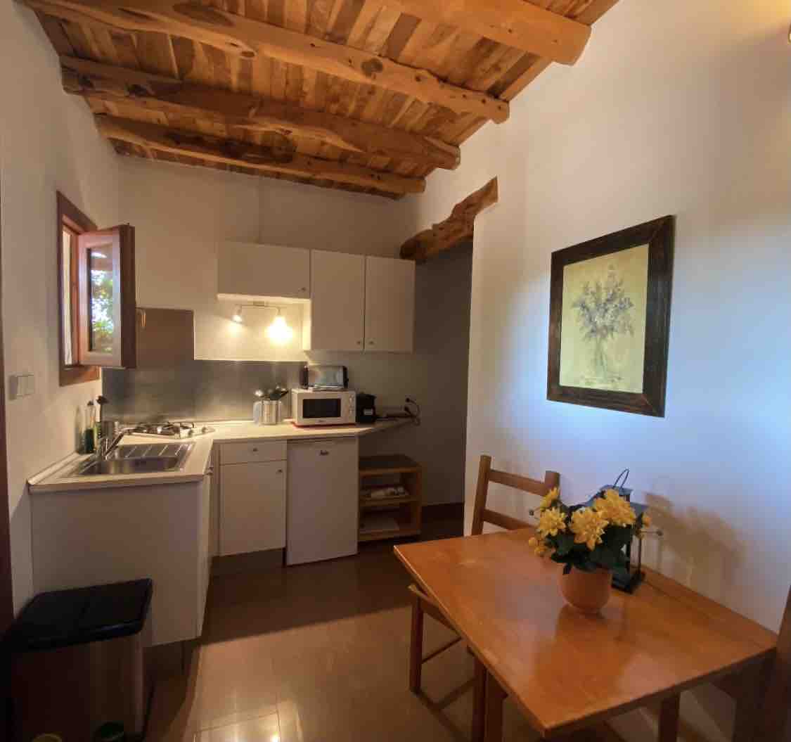 The apartment has a bedroom with a double bed, a bathroom with a shower, an open kitchen with an American bar, and a covered terrace overlooking the garden. The room is composed of a 135 cm by 190 cm bed, closet, 24" smart TV The living room/kitchen has a dining table with chairs. The open kitchen with an American bar has a fridge, microwave, Italian moka coffee maker, toaster, dishes and cutlery needed for simple meals.