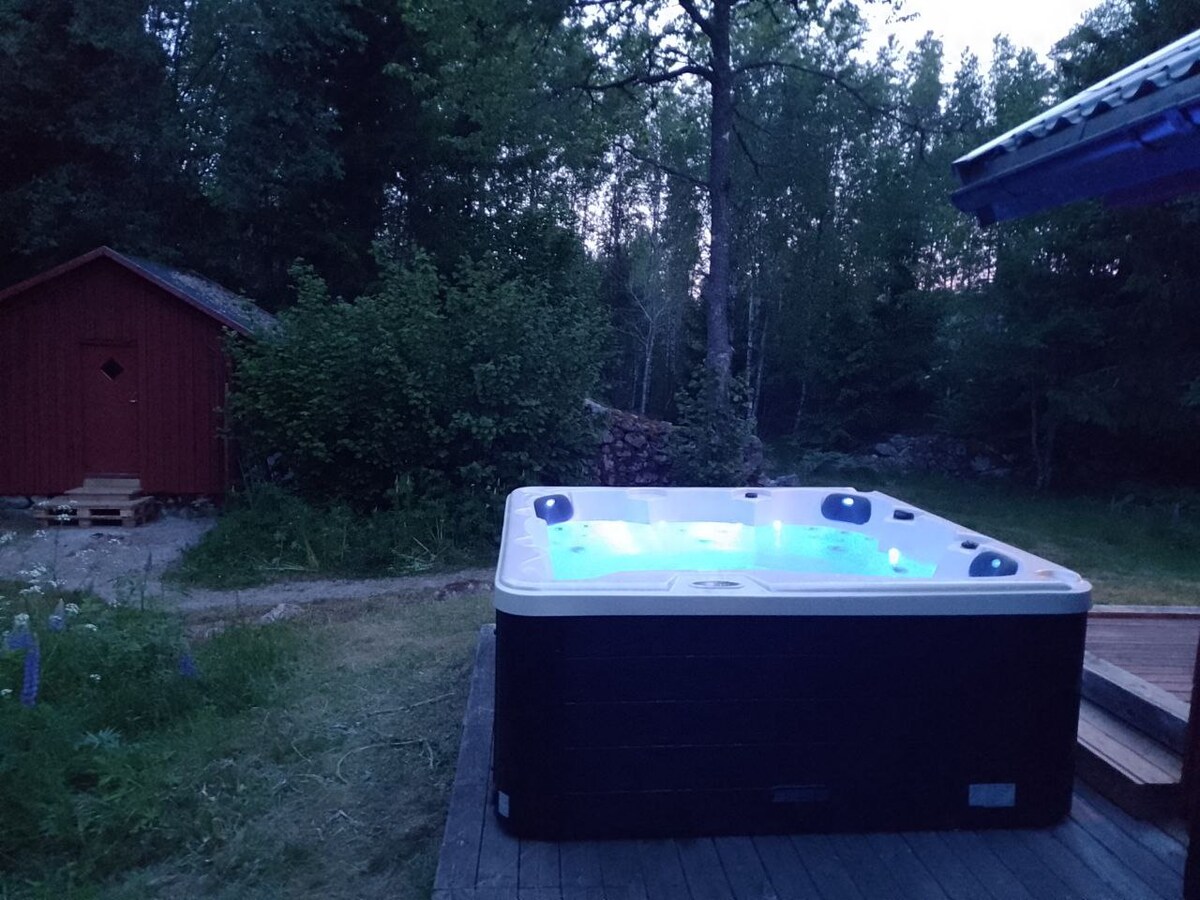 Experience the Småland idyll Ramnäs. With a 5-minute walk to the beach where you can enjoy the sun/swimming, fishing, canoeing. Around the knot, there is the forest for those interested in the outdoors, Ikea Musem 1.7 km away. Our cozy newly built cottage with plenty of space to hang out, 3 bedrooms offers 7 sleeping places. Hot tub on the terrace, sauna and a lovely outdoor grill and pizzaowen for a cozy hangout. The rent includes 1 canoe for 3 per person, and bicycles to borrow.