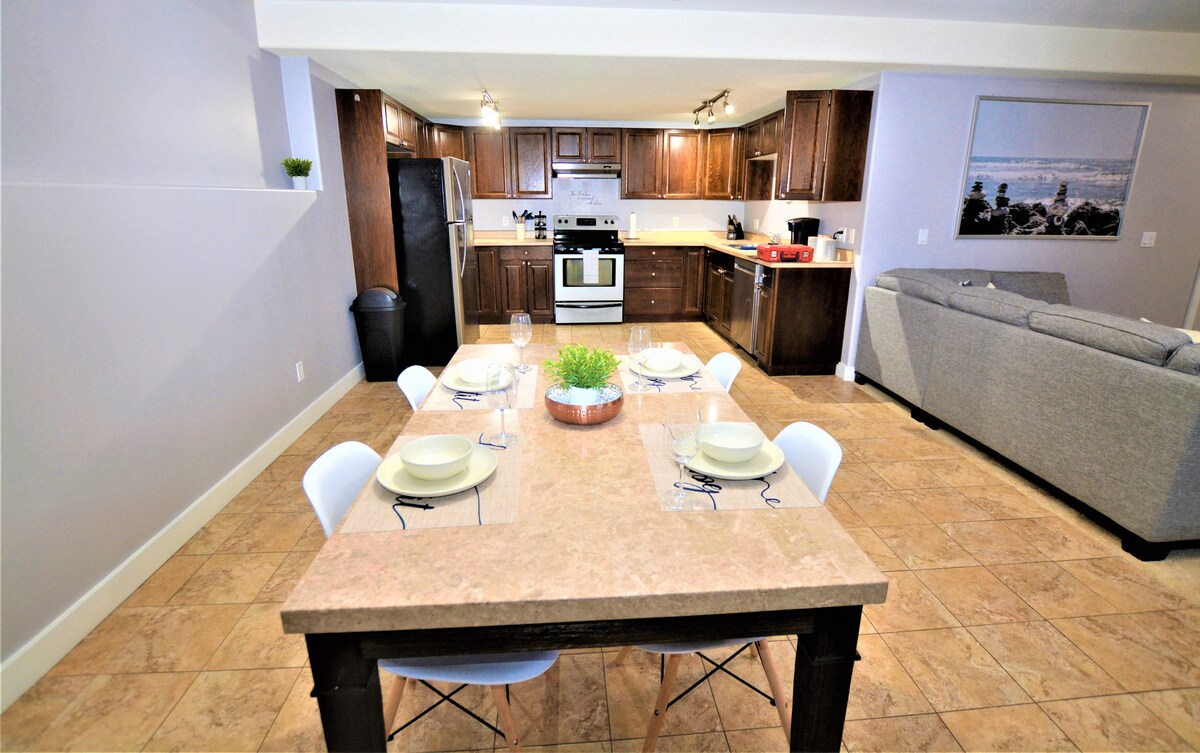 This modern basement apartment showcases the best use of small spaces with 2 bedrooms, 3 beds, 1 full bath, dining area, full kitchen and ample living room space. Separate entrance from the main house. This beautiful apartment comes with its own full kitchen, fridge, electric stove, Microwave, toaster, kettle, cookware, modern 3-piece washroom. It's own washer/dryer, queen beds, dresser, closet space, TV/Internet. *Companies are welcome to book. Please message via Airbnb messaging.