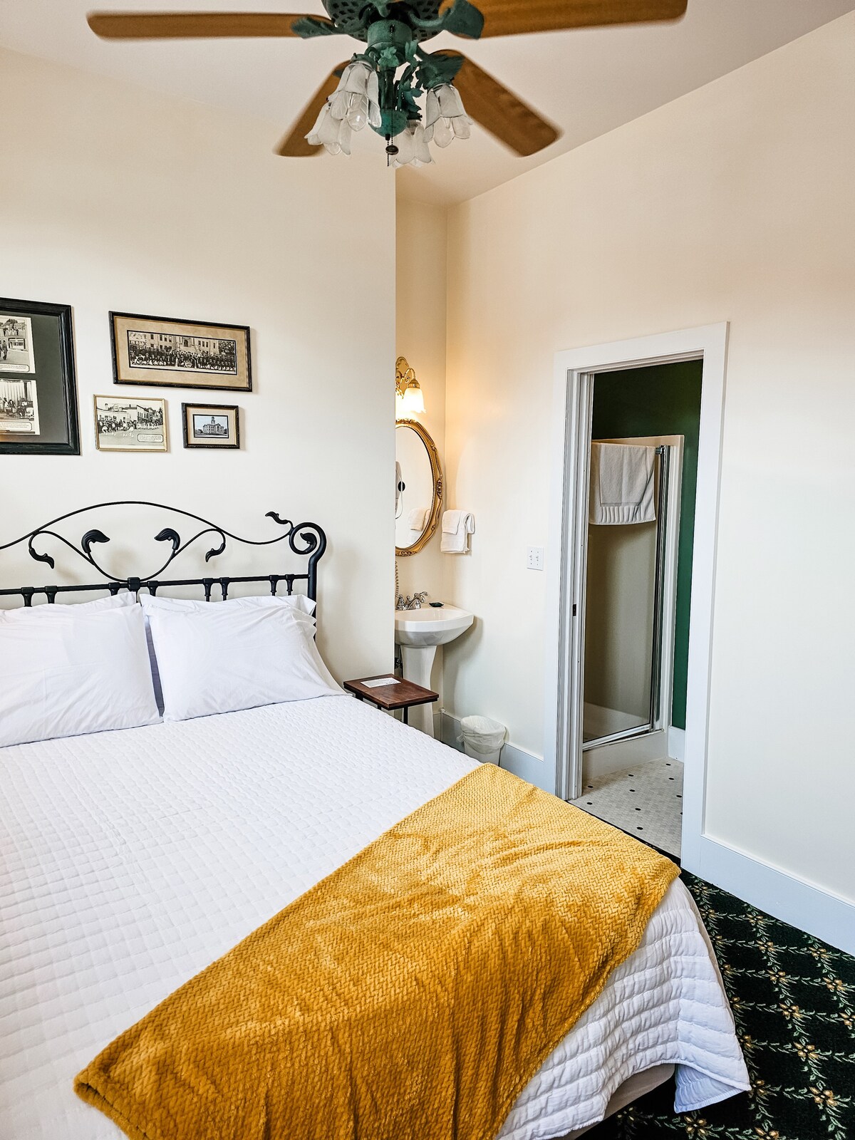 Perched on the third floor, Evanson's Loft honors another early McFarland family whose roots reflect the industrious spirit of the village's growth. This suite feels like a private apartment that is perfect for modern pioneers carving their own path. Queen bed Full kitchen Separate living room Custom bath With its elevated vantage point and added independence, Evanson's loft is especially suited for traveling professionals, digital nomads, or guests looking for extended stays.
