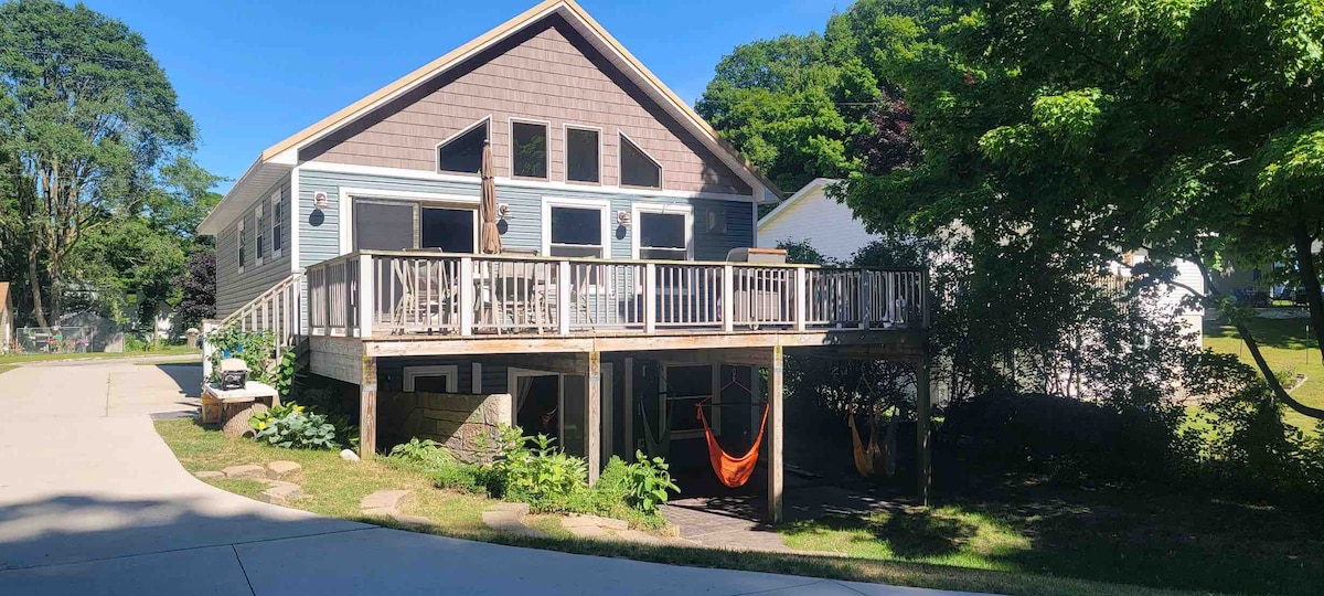 Entire lake house with plenty of sleeping space for families. Four bedrooms and seven beds (counting two trundle beds). The house was recently renovated to add a sun room and transform the first floor into an open concept with a spacious kitchen and living room. There are two sets of washer/dryer in the basement to accommodate large groups. Walk across the street to Crystal Lake, wander two blocks to downtown for a meal or hang out back by the creek and listen for frogs by campfire light.