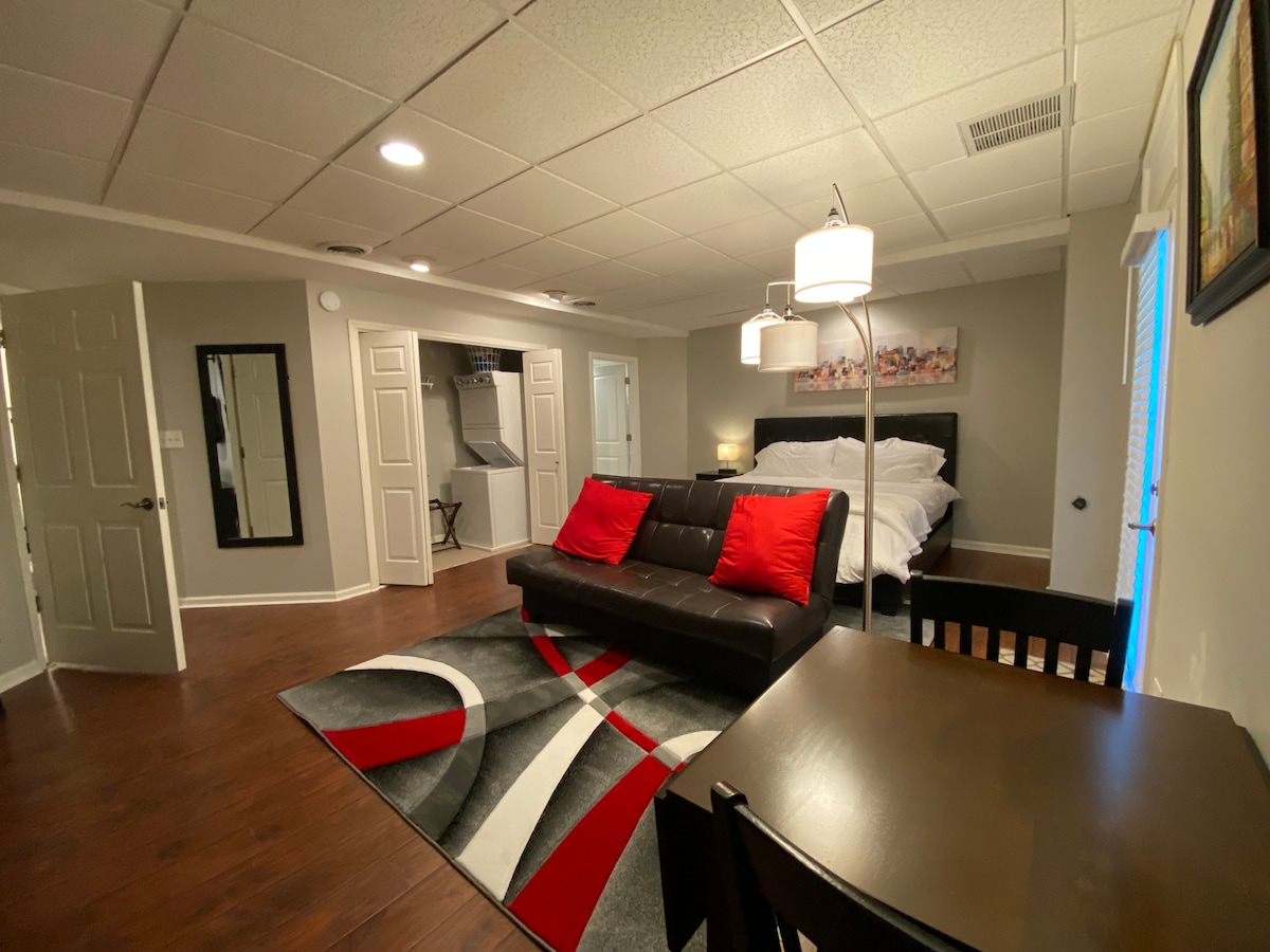 This charming yet sophisticated basement level apt will invite you to settle in and you may not want to leave! Our guests love the king size bed and oversize chair and ottoman and bonus- you can watch tv from both. The kitchenette is equipped with microwave, toaster, mini-fridge, coffee maker, and ironing board. The bathroom is stocked with linens & toiletries. There is plenty of room in the walk-in closet for clothes/bags or make use of the dresser. This space is perfectly suited for 2 guests.