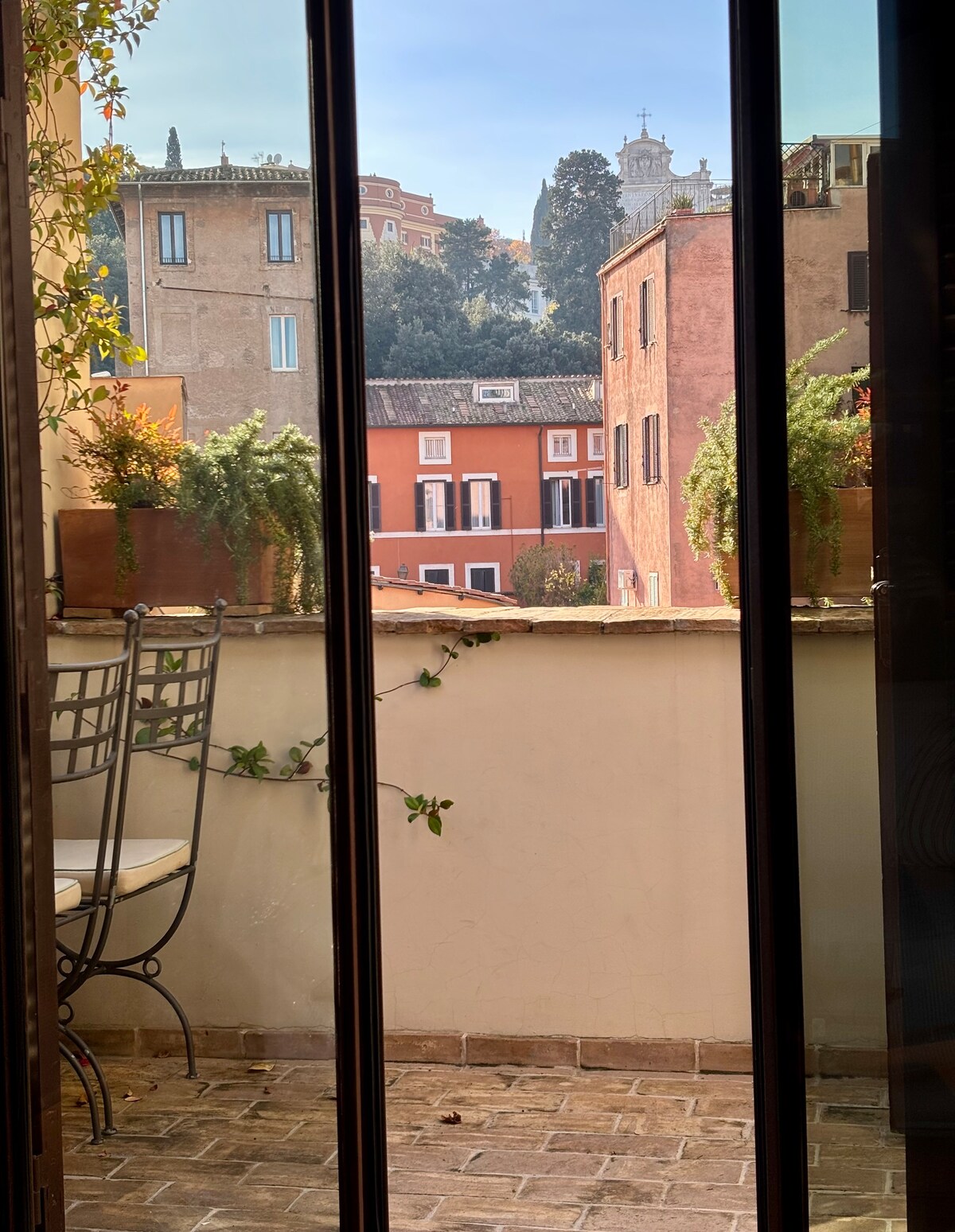 Bright and quiet penthouse apartment in the heart of Trastevere, with a wonderful terrace and an unparalleled view of charming roman roofs and the Gianicolo hill. The flat is meticulously refurbished and set in a picturesque cobblestoned street, just around the corner from the lively restaurants and cafes. La Casetta al Mattonato is located on the 3rd floor (41 steps, no elevator) of a 1600s typical roman building, within walking distance of all major attractions.
