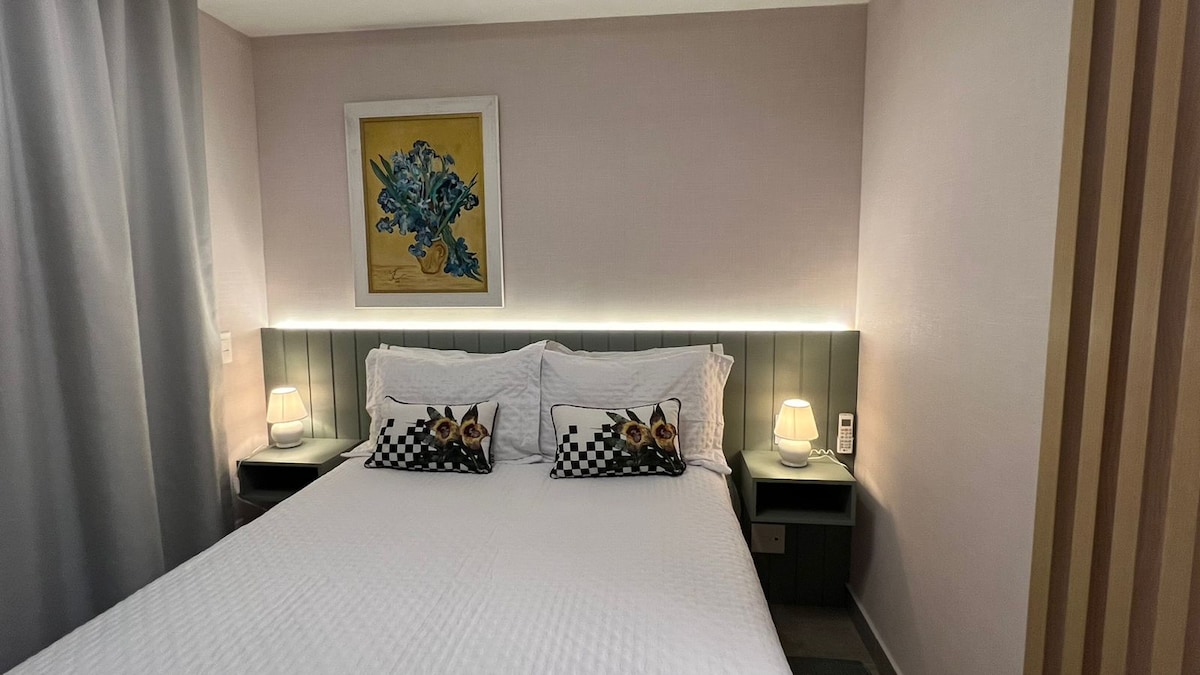 Kick back and relax in this calm, stylish space. My Ap prioritizes comfort, rest after a hectic day in the metropolis. Ideal for up to 2 people, equipped with a standard Hotel Queen bed, air-conditioning, 250Mb internet, 42" Smart TV; plus kitchen with microwave, induction stove, sandwich maker, toaster, electric kettle, coffee maker and mini fridge. It has a work table for 2 people, with comfortable leather chairs. You will sleep with anti-noise windows and 100% blackout curtains