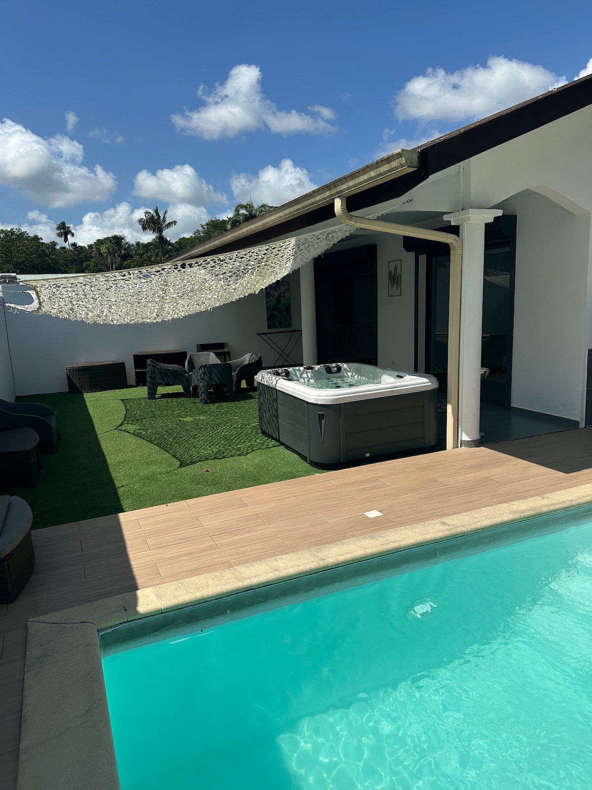 Cette belle villa est située sur une propriété privée, calme et sécurisée à 15 min de Cayenne et 5min de l'aéroport. Cosy et confortable, elle peut accueillir 4 personnes dont 3 adultes. Elle dispose d'une chambre climatisée avec salle de bain et WC, de la TV avec boxe orange et Netflix, d'un salon avec un canapé convertible confortable, d'une cuisine équipée et d'une terrasse aménagée. L'accès au SPA privé et à la piscine est gratuit. La villa dispose d'un parking privé et du wifi haut débit.