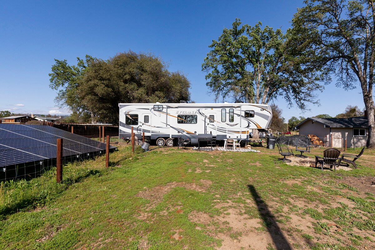 This fully renovated 5th wheel has everything you need, plus No Cleaning Fee! Situated on a hilltop in a quiet foothill neighborhood, you'll have a lovely view of our little valley and mountains. It sports a full kitchen with basics for cooking, RO for purified water, fridge/freezer, coffee maker & , Amazon Fire TV, WIFI, small but well equipped full bathroom, natural latex queen sized bed, AC & heat. Enjoy coffee and fresh eggs, and while you watch the pigs and chickens graze below.
