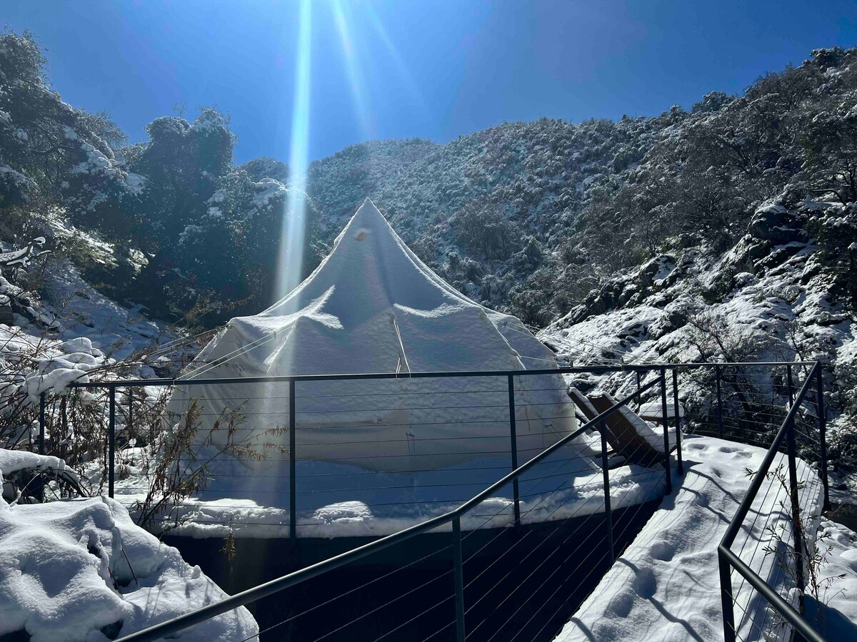 The Luna Bell at Camp ikigai is a luxury safari-style bell tent nestled on a private off-grid sanctuary in the Sierra foothills. Enjoy a real bed, cozy furnishings, and a wood stove for cool nights, surrounded by nature and open skies. This peaceful glamping retreat offers comfort without distraction—perfect for stargazing, quiet reflection, and unplugging while staying close to Sequoia & Kings Canyon National Parks.
