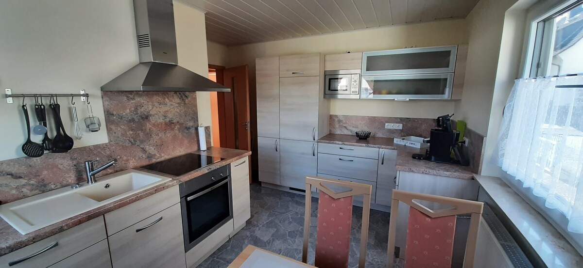 Panoramic 60 m² apartment – for up to 4 guests • King-size bed, sofa bed, folding bed (on request), baby crib • Fully equipped kitchen: stove, oven, kettle, coffee machine, dishwasher, fridge, TV • High-quality linens, towels, coffee & tea • Large terrace with sun lounger, nature view Great location: • 5 min by car / 30 min walk to Idstein center • Hiking trails start at the door • 20 min to Frankfurt Airport & Wiesbaden • 2 km to autobahn • Nearby playground & top grill restaurant