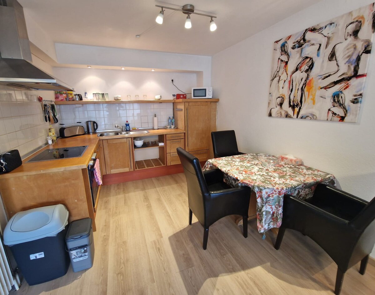 This approx. 55 sqm apartment has been lovingly renovated and offers you a perfect retreat. Bedroom with 160 x 200 box spring bed, small balcony to the terrace. Large living room, thanks to a sofa bed for up to 4 people. First-class bathroom with rain shower, whirlpool bathtub. Free parking and a great terrace with a grill and views of the countryside! Fully equipped kitchen with stove, oven, kettle, toaster, coffee maker, etc.