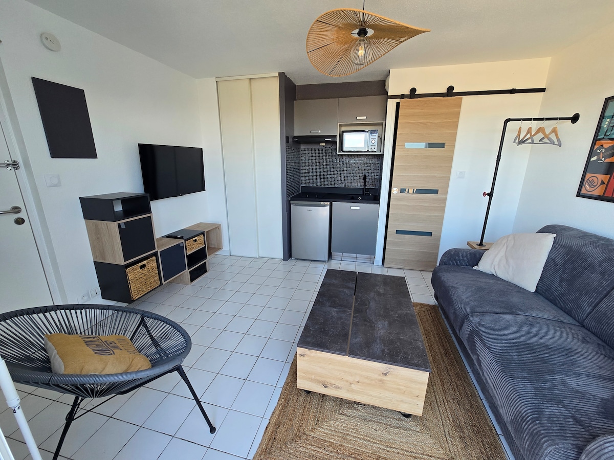 Fully equipped furnished studio in Sète, for 4 people in secure residence with closed parking. In a residence with direct access to the beach. This studio consists of a sofa that converts into a recent and comfortable bed, 1 single bed and a chair that converts into a single bed. The studio has a bathroom, separate toilet, fully equipped kitchenette. Plus, there's a private parking space Bed linen is changed between each rental. With sea views, Wi-Fi