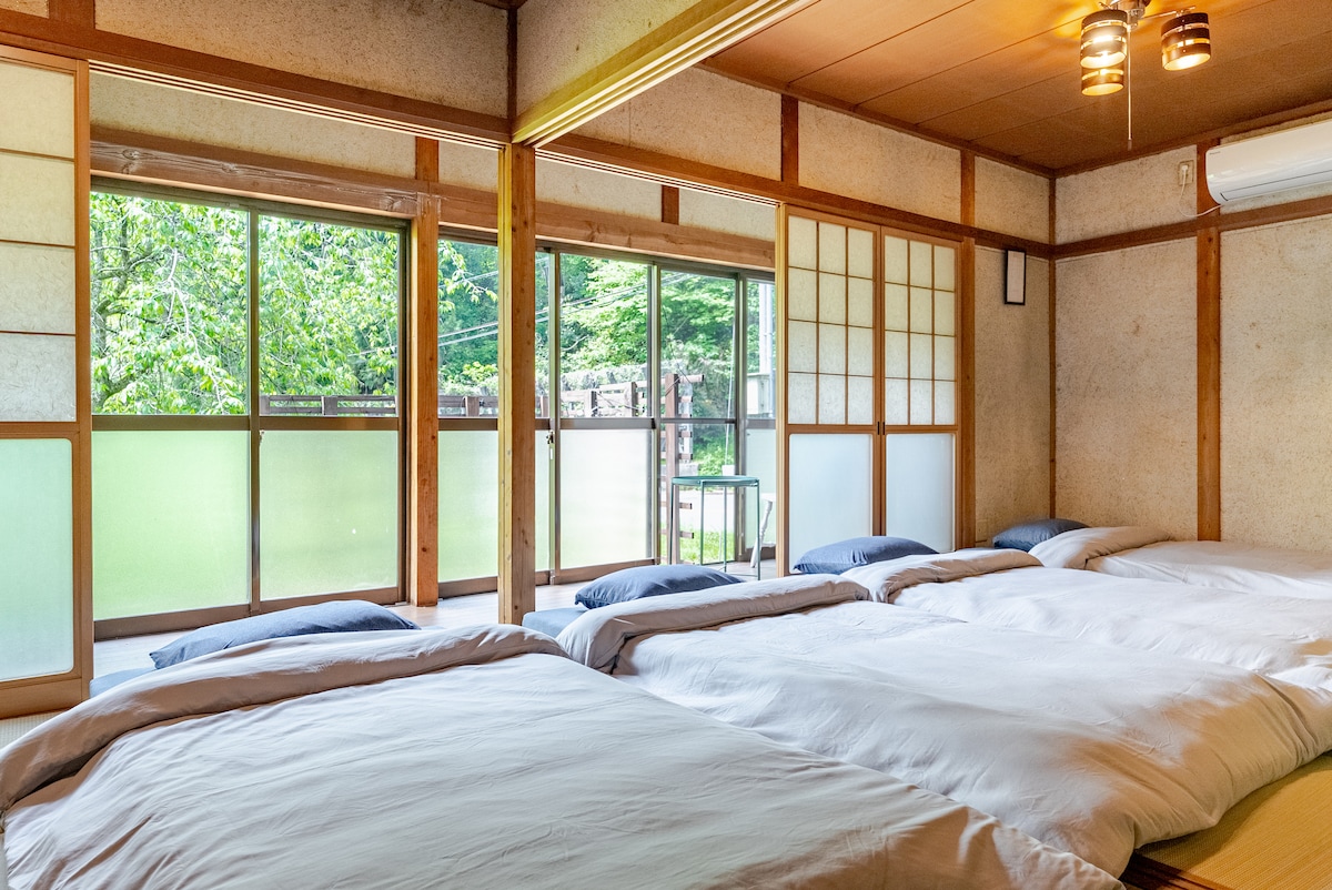 Relax to the sound of Itadori river and take a swim or SUP boarding. Awake to bird songs with the whole family or friends at this peaceful bungalow and spacious traditional Japanese garden with three maple trees and sixteen pine trees. There’s a garnet stone table with seating a fire pit and bbq a 10 meter long hammock to lay under the stars at night sky or relax in the day. Only 3 minutes on foot to Monet’s Pond, 10 minutes to 21st Century Park by car and 15 minutes to Itadori Hot Springs.