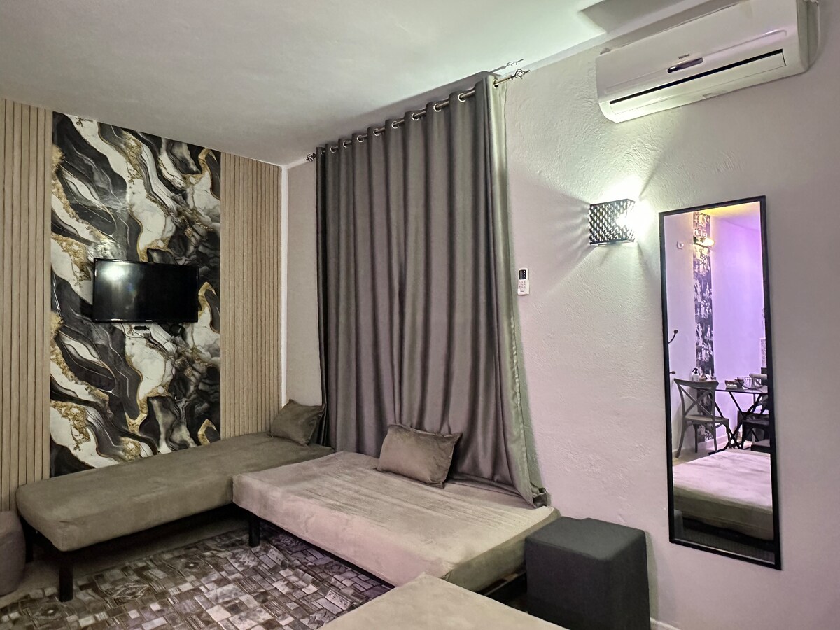 Découvrez un studio moderne S+1 conçu avec élégance pour un séjour confortable et relaxant. Parfait pour couples, voyageurs ou séjours professionnels. 2 kilomètres seulement de la plage.