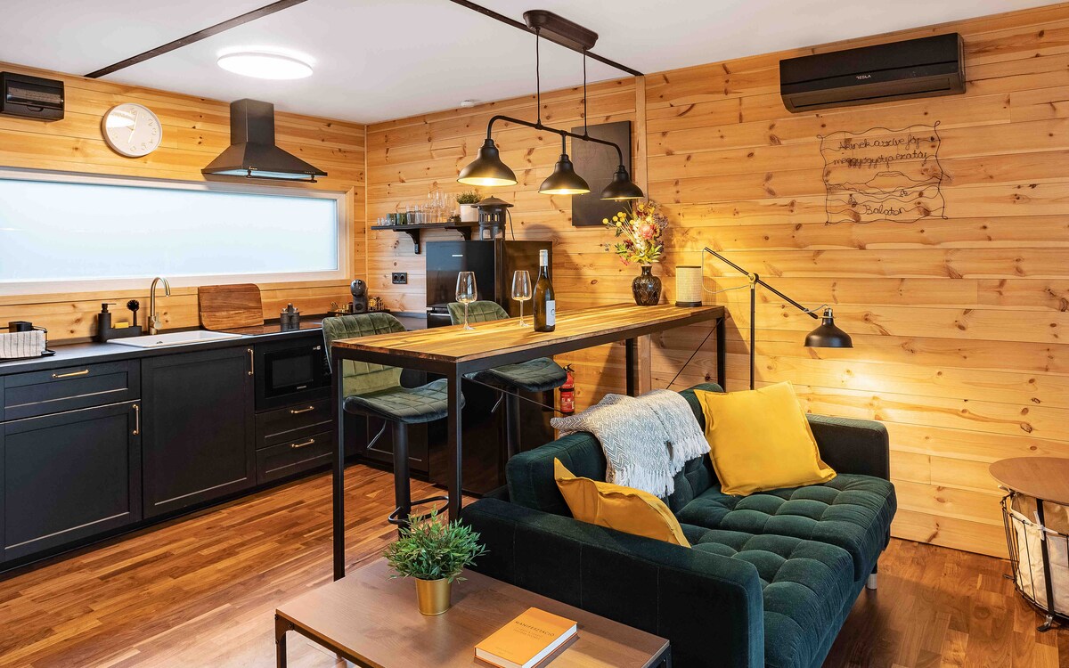 Lean back and relax in this new, perfectly equipped, stylish place and spacious garden! The Champagne Apartment is a quiet, close to nature and discreet home, from where you can reach the center of Balatonfüred and the shores of Lake Balaton in a few minutes. Perfect for hikers and cyclists. The stairs to the gallery are steep, so come with children who are not yet climbing or are already climbing safely. I provide a travel bed, baby bath, changing mat, and high chair for babies.