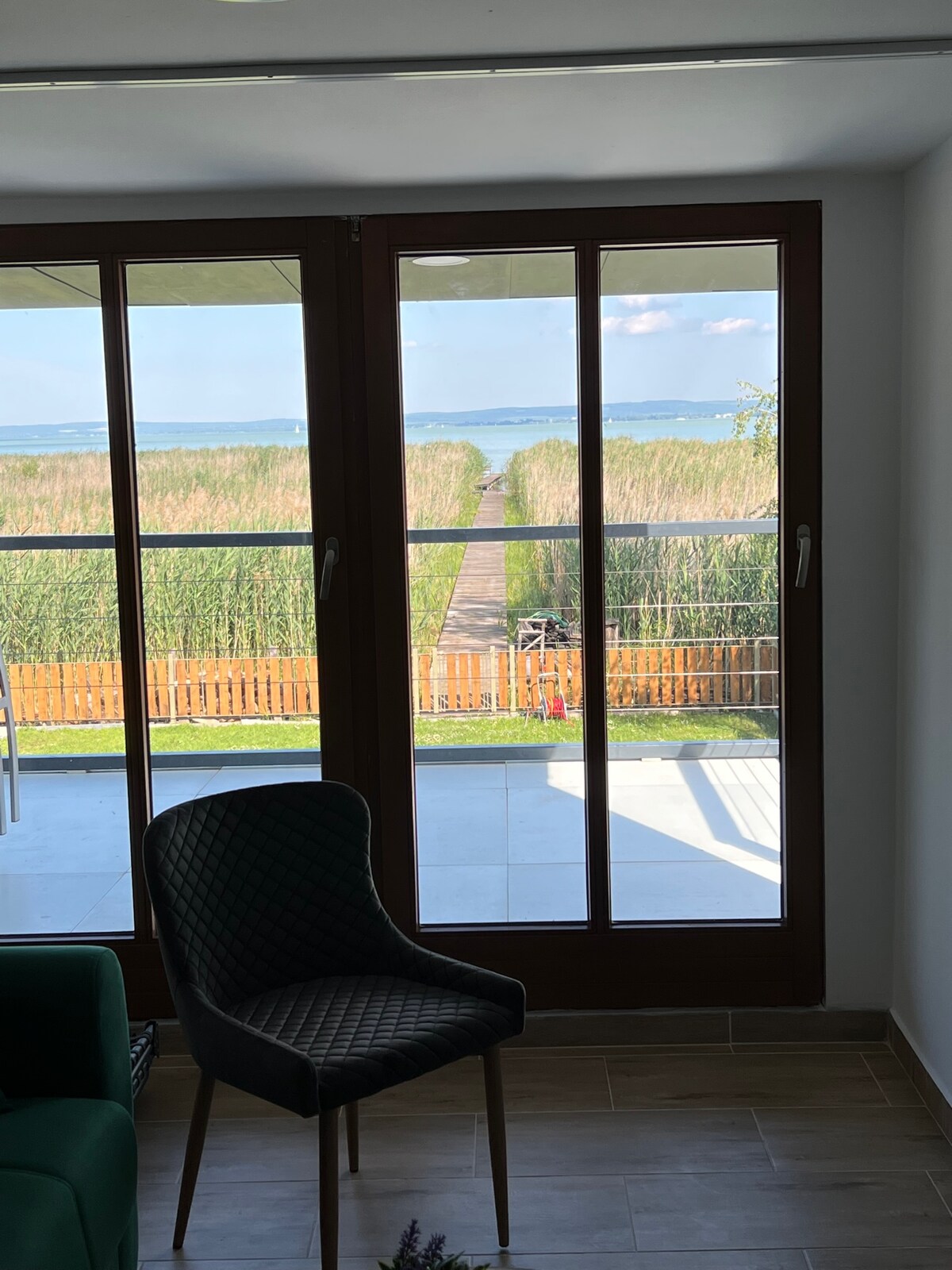 A truly special place just an hour from Budapest. A newly built "old house" with fully opening doors onto the huge patio overlooking Lake Balaton’s biggest bay. See wicked storms approaching over the lake, the always changing clouds and colours of the sky. Welcoming anyone who values this unique experience and the warm design of the house. Get away to the studio if you need to work while still enjoying this special atmosphere. Winter is also very special with breathtaking sunsets and a hottub.