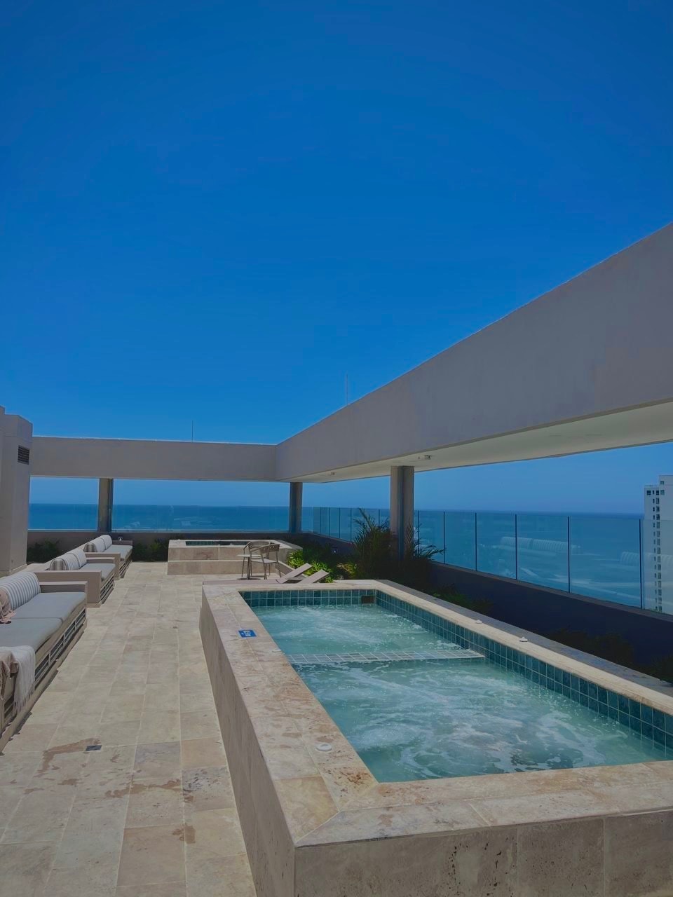 Live an unforgettable experience in Santa Marta with family or friends at a beautiful beach club. You will find: 🛁 Jacuzzis. 🛏️ 2 bedrooms with queen and single beds. 🍳 Fully equipped kitchen to prepare whatever you need. 🌅 Private balcony with ocean view. 🏖️ Direct beach access. 🏊 Building with 4 pools. 🏋️ Gym. 🧖 Spa and wellness areas. 🍽️ Restaurant with breakfast option. 👩💻 Coworking area. 🔐 Safe and exclusive environment.