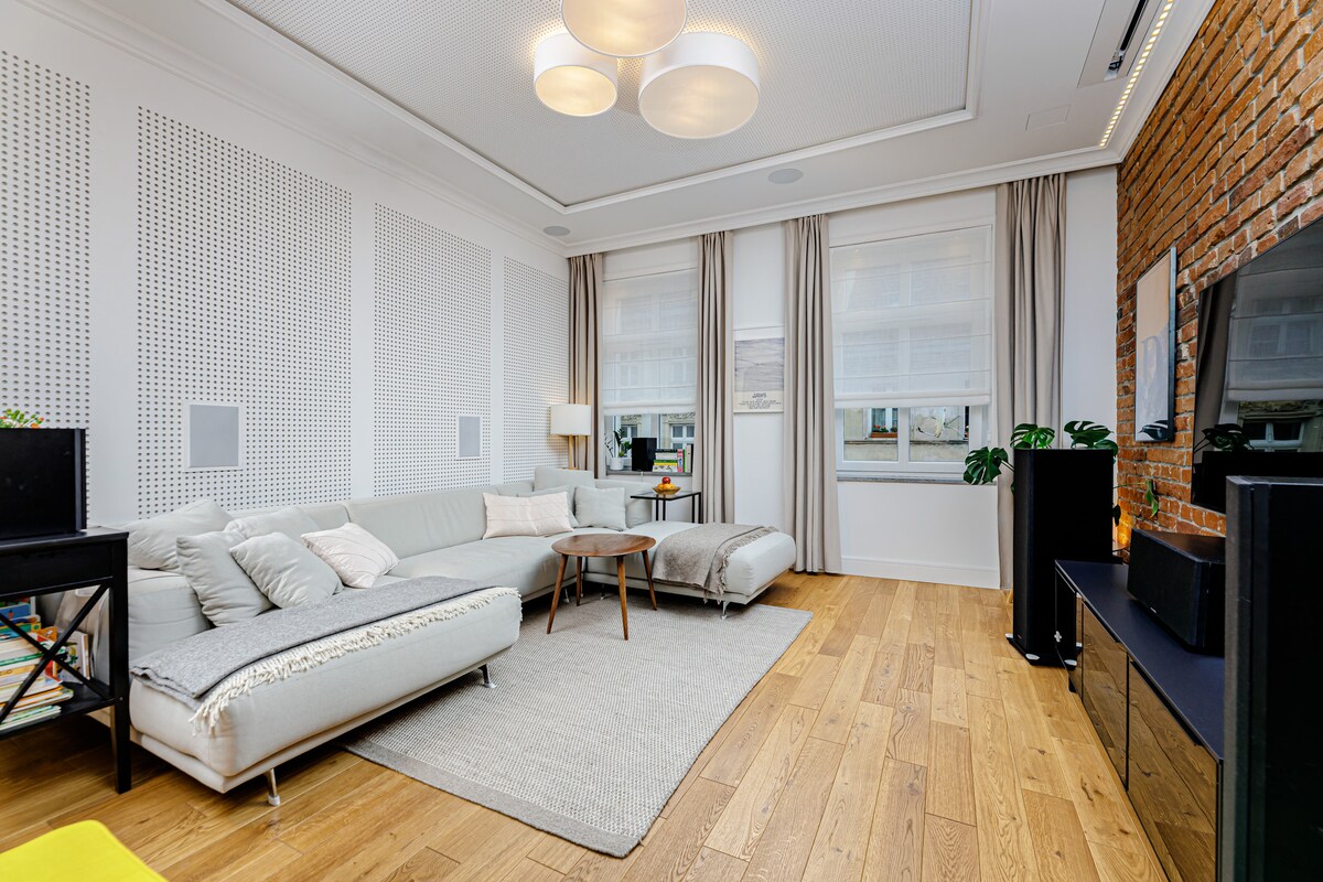 1 minute walk from the Market Square - experience Wroclaw like never before! An amazing space where the restored interior of a 19th century tenement collides with modernity and functionality. The stylish, light-filled apartment, located on a side street of Wroclaw's Market Square, fits perfectly into the historic character of the neighborhood. This is a unique place for thirsty music and film lovers, with a precisely designed acoustic sphere in the living room, inspired by Wrocław's NFM.