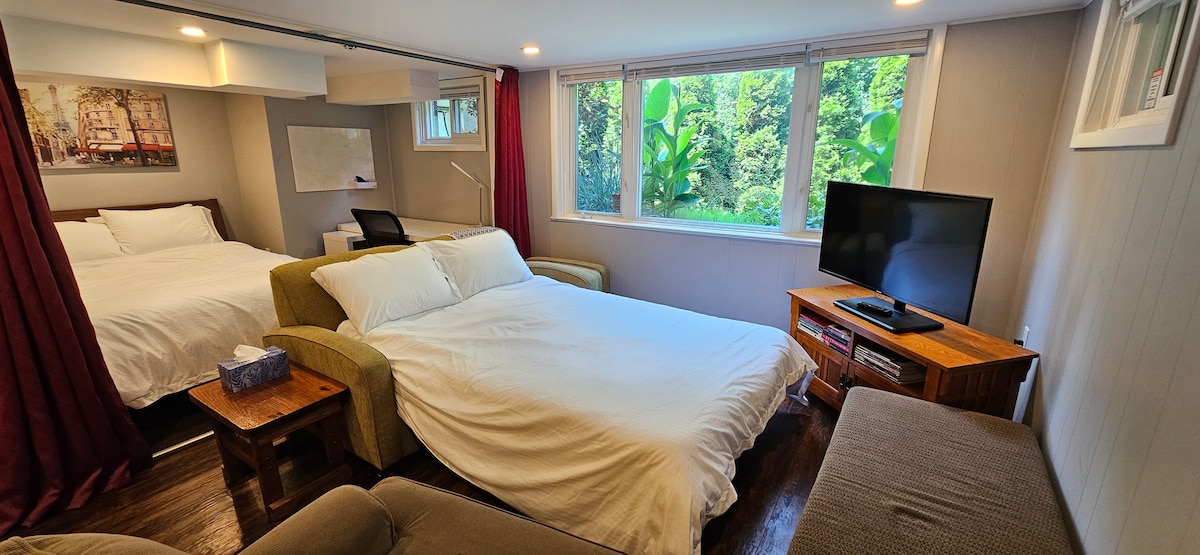 Bright, clean and cozy - we are a respectful family of 3, and welcome you for your stay. This area is ideal for those who like to keep to themselves, with a private bedroom, kitchen, and living room. It can be entered directly from outside. Included with two stylish pull-out couches (can be turned into beds), an open kitchen provided with cooking utensils and equipment, protected with outdoor security cameras, as well as a washing machine to take care of dirty laundry.