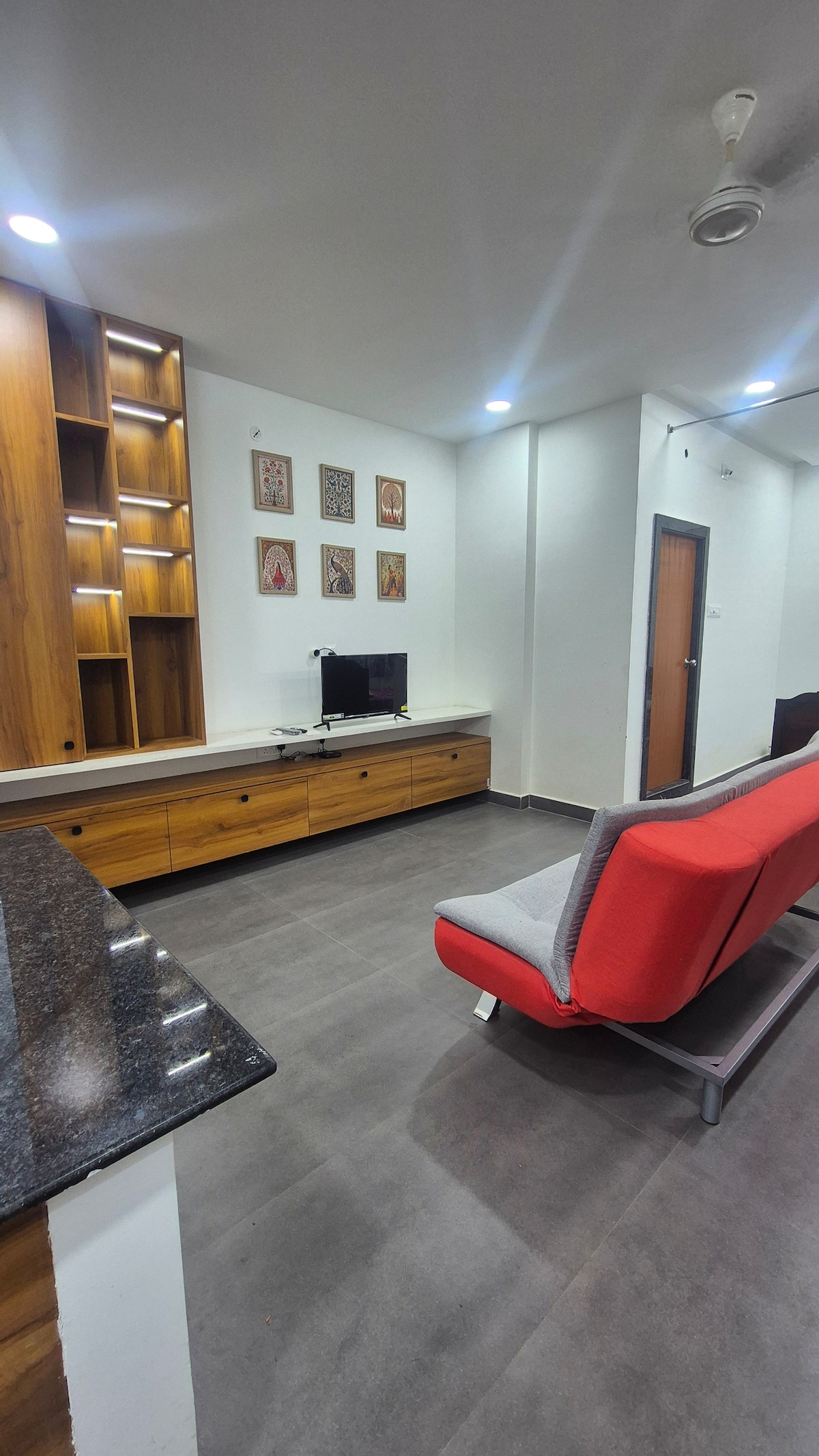 Om Square, a modern and stylish studio located in the heart of the city, just a stone's throw away from A plus Convention Hall and Lalita Jewelry near Benz Circle. It is a well-designed living area, tastefully decorated to create a comfortable and inviting ambiance. It features a separate dining area where you can enjoy your meals. The compact kitchen is equipped with a gas stove and basic utensils. Also includes a Whirlpool refrigerator, microwave, hot water kettle, and RO Water.