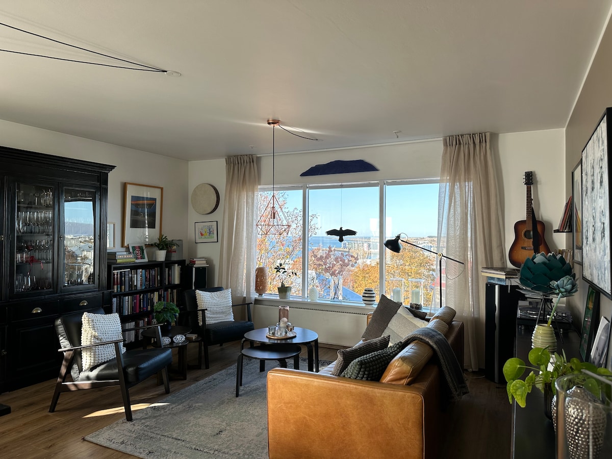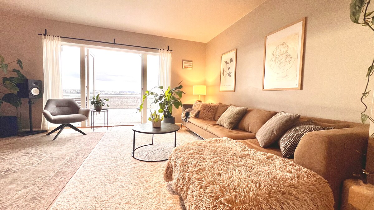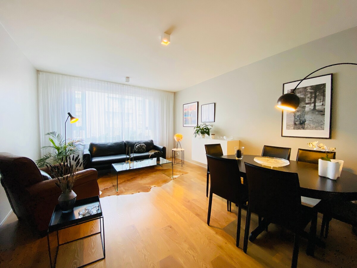 Beautiful and stylish two-bedroom apartment. The apartment is on the 3rd floor, with cozy furnished balconies. The main bedroom has a king-size bed and the second one has a brand new and comfortable sleeping couch. The living room has a big smart TV, the kitchen is fully equipped and there is a washing machine and dryer in the bathroom. The apartment is in 5 min walking distance to Bonus supermarket as well as Cosco, 212 Bistro, and Dæinn coffeehouse. Only 15 min drive to downtown Reykjavik.