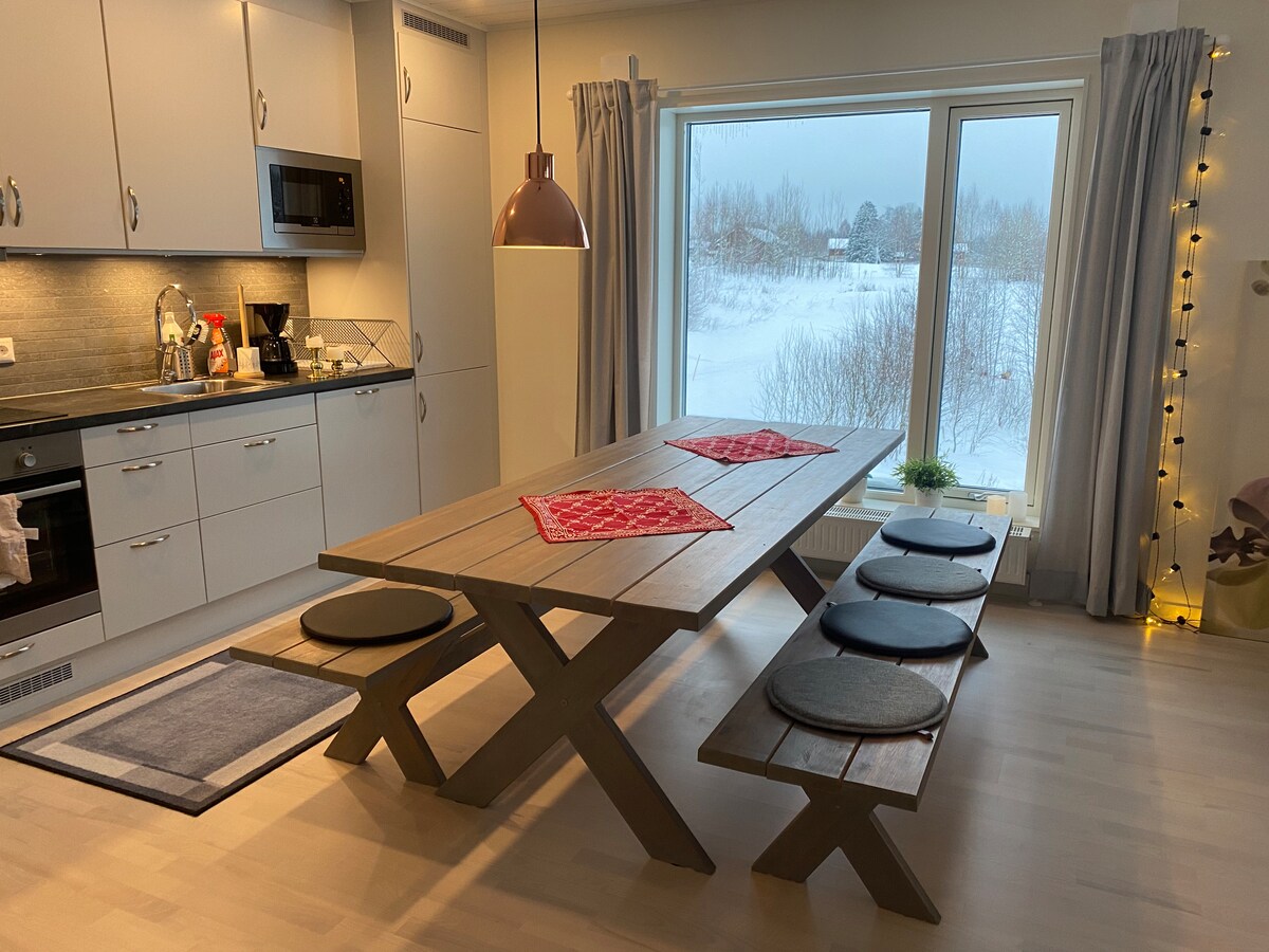The apartment is located just under 5 km from E4 and 8 km from Söderhamn. It is on the upper floor of a two-family house and has its own entrance. The apartment has a fully equipped kitchen, shower and toilet with washing machine. It has a double bedroom and two small rooms with two beds in each. There is also a sofa bed in one room. Bed linens are available, but bed linens and towels can be rented for 150 SEK/set. On the property, there is a gym with a ping pong table, a wood-fired sauna and in summer also a heated pool to use.