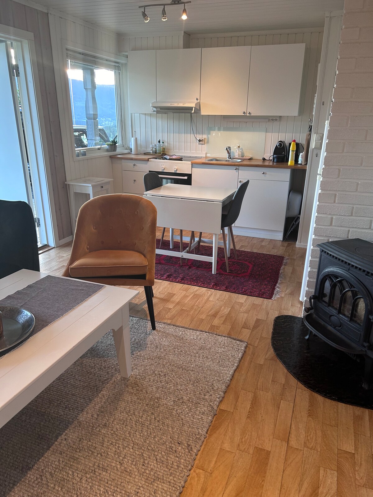 The apartment consists of an open plan living room/kitchen, a bedroom, and a bathroom. The bedroom consists of 2 comfortable beds put together as a double bed of 180 cm. In the living room there is a sofa bed with room for one person, 120 cm. The apartment is in a very nice and quiet neighborhood, with amazing views of Strandefjorden. Great hiking possibilities nearby. A nice host, who takes good care of his guests