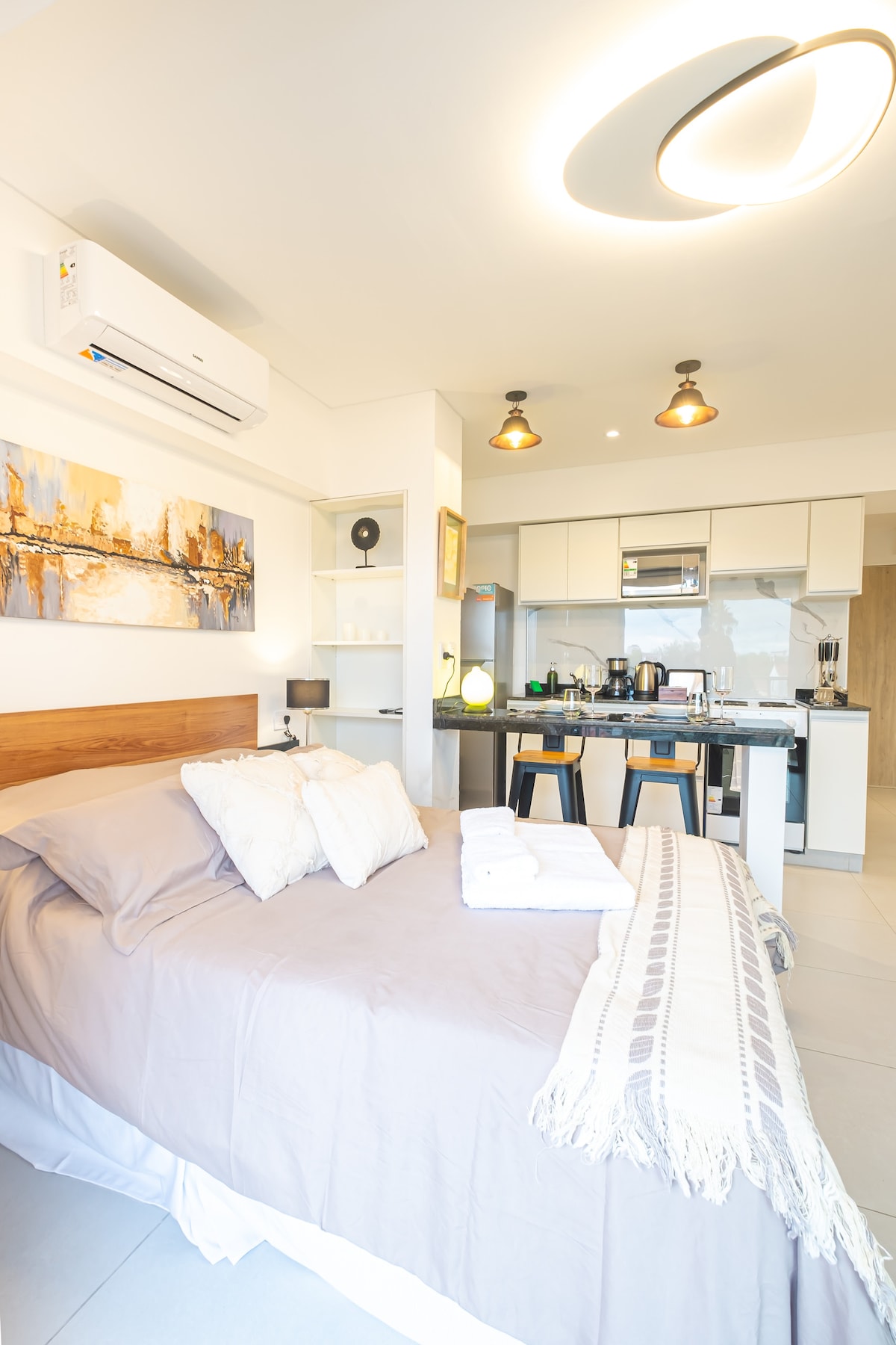 New studio, set for a comfortable stay in the city. It has air conditioning, central heating, a double bed and a kitchen/dining area, as well as a spacious bathroom. Non-smoking space. It is located inside a family building, approximately 10 blocks from downtown, 4 blocks from Alto Noa shopping and the Balcarce gastronomic area.