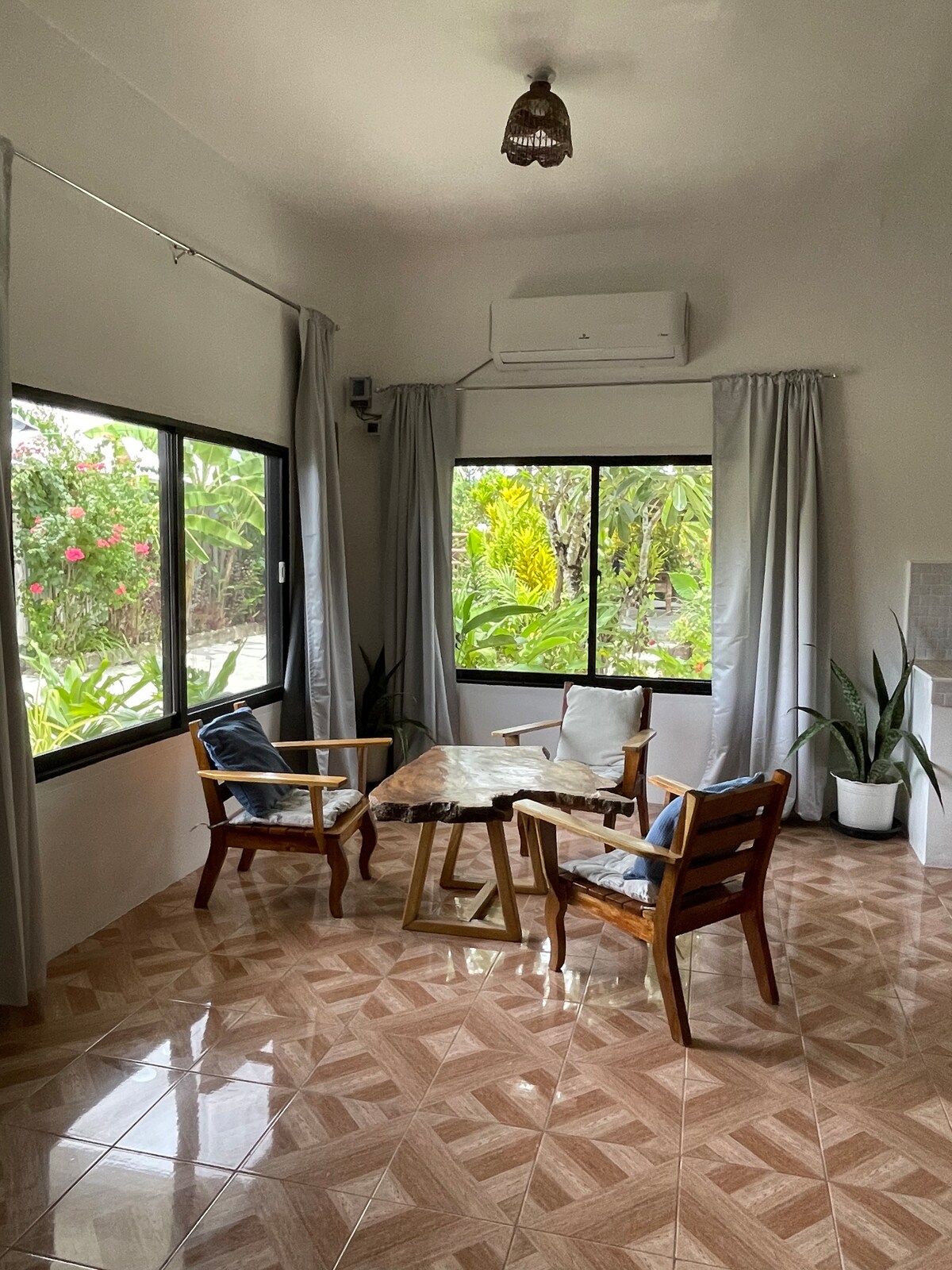 The self-contained and furnished unit is equipped with a private kitchenette and large fridge, cooking and dining equipment, lots of storage space, a TV and its own private toilet and shower (with hot water). The gated and fenced compound is a safe and tranquil space to relax from an active day of surfing or exploring General Luna. If you work online, the fast fiber internet will allow you to work from home as well, either in the air-conditioned living area or in the covered patio outdoors.
