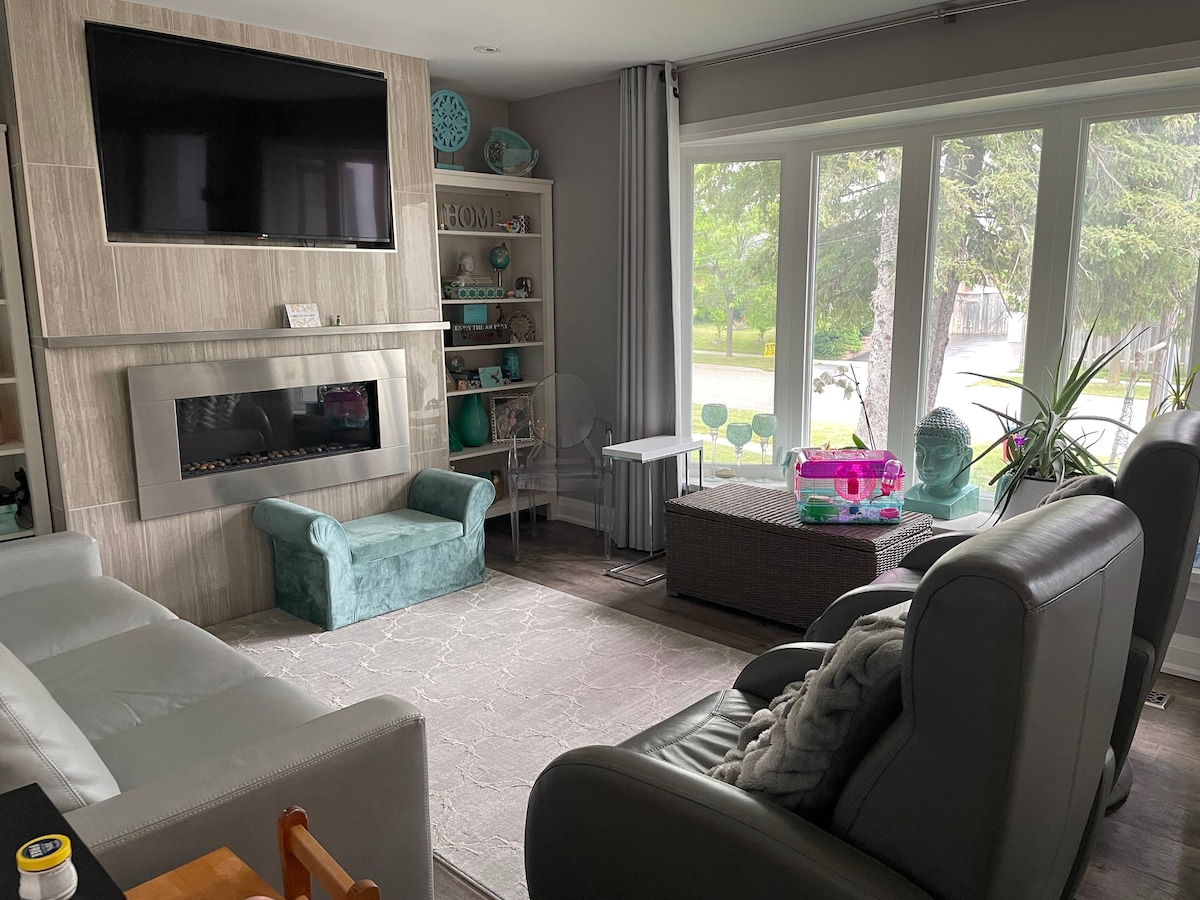 Newly renovated, 1-bedroom walkout basement apartment! ✅ 750 sq. ft. of open space with large windows, making it bright and airy Cozy living area with: ✅ Sofa ✅ Day bed that extends to a king bed ✅ Fireplace ✅ Smart TV Modern kitchen equipped with: ✅ Dishwasher ✅ Microwave ✅ Washer and dryer ✅ Coffee machine ✅ Oven, toaster, etc. ✅ Outdoor area with a patio and BBQ ✅ 2 Parking Spots on driveway Perfect for family vacations or business trips! 😊