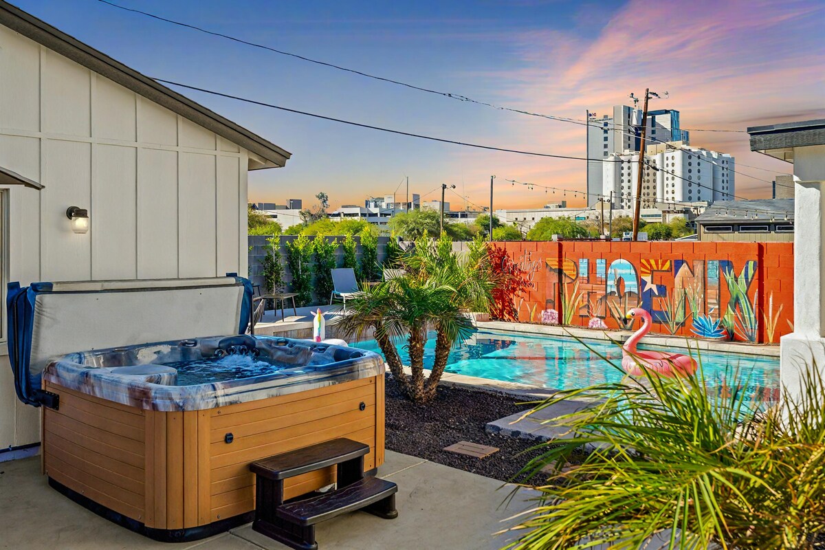 Discover your stylish oasis in South Scottsdale, moments from Old Town. This 4-bedroom w/ 7 beds retreat features all new furniture, TVs in every room, pool table, arcade game, and memory foam mattresses. The fully remodeled house offers a dazzling sunset mural as you walk out to the spacious backyard for games, BBQ, hammock, outdoor dining table, plenty of seating and a beautiful diving pool with electric heater (inquire for more info). Have the ultimate time at this relaxing retreat!