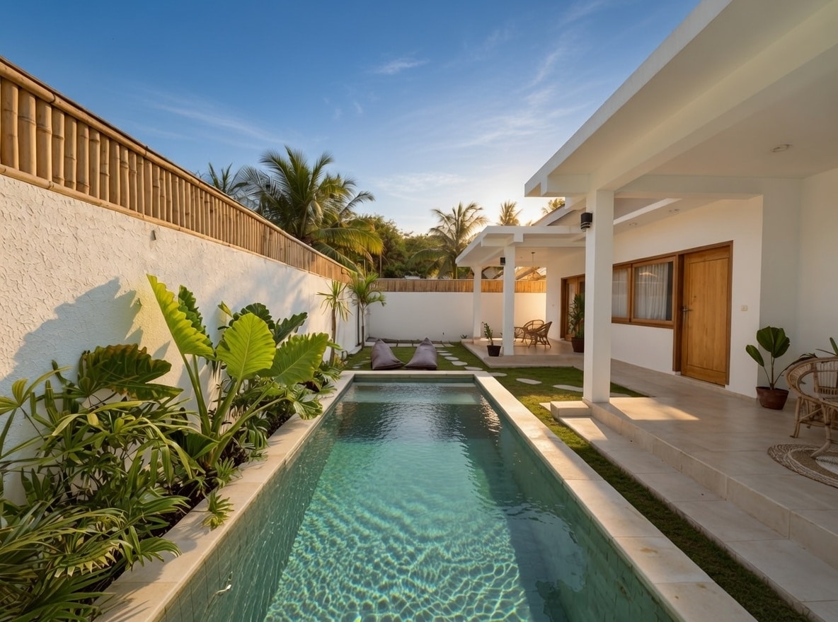 Brand-new private villa in a peaceful resort in the heart of Kuta Lombok. Enjoy 100 m² of fully private space with your own pool, modern kitchen, and air-conditioned bedroom with king-size bed. Housekeeping included. A complimentary Pilates mat set is provided for workouts, stretching, or yoga by the pool. 24/7 on-site staff, CCTV security, night guard, private parking, and lobby welcome. Quiet dead-end street, birds in the morning, 5 minutes by scooter from Kuta Beach.