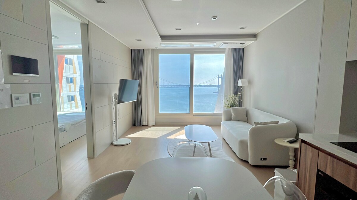 ❤️Recently, we have expanded the room With 2 bedrooms and 1 living room You can sleep comfortably with 1 queen bed and 2 double beds:) Thank you for visiting Anri villa. Fantastic bridge view with super 🎇close Gwangan Bridge (full ocean view) You can see it from both the💕 living room and the bedroom. Healing Full Ocean View and Gwangan Bridge View "Share your life"💖 Newly-built 20-pyeong, premium-class accommodation👍 We prioritize washing, sanitizing, cleaning, and cleanliness of bedding every day.😉🎇 Free parking on the 1st to 3rd floors of the🍃 accommodation building (self-propelled) Enjoy 🍃Netflix YouTube and more with a smart TV. Milak The Market 🍃right next door, 10 minutes by car from Haeundae There are amenities such as a cafe and wine shop on the 🍃first floor. 🍃🍃 Antistress tea (organic), hand drip coffee, and incense are available. If your mind is complicated, I hope it will be a little relieved with hot tea and scents.
