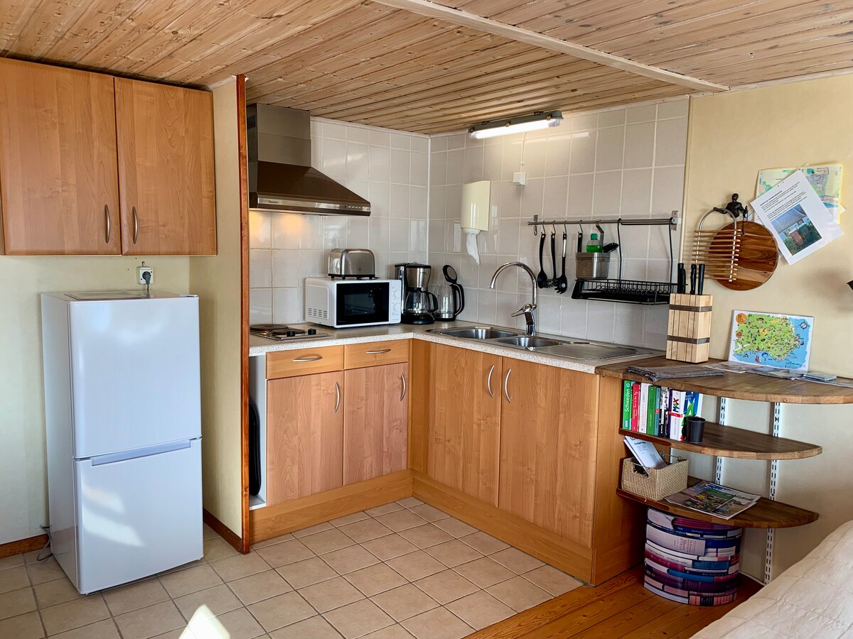 The location of the house is perfect for bicycle rides and hiking along the coast. Rocky swimming areas, wonderful white beaches nearby. Three bicycles (as well as two for children) that can be borrowed for free. Our guest house is located in a village with several restaurants/cafés that are mainly open in the summer. You'll like the little charming house because of the tranquility, the secluded garden and the proximity to the sea. The house is only about 150 meters from the beach. The accommodation is best suited for couples or small families.